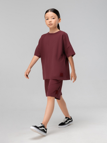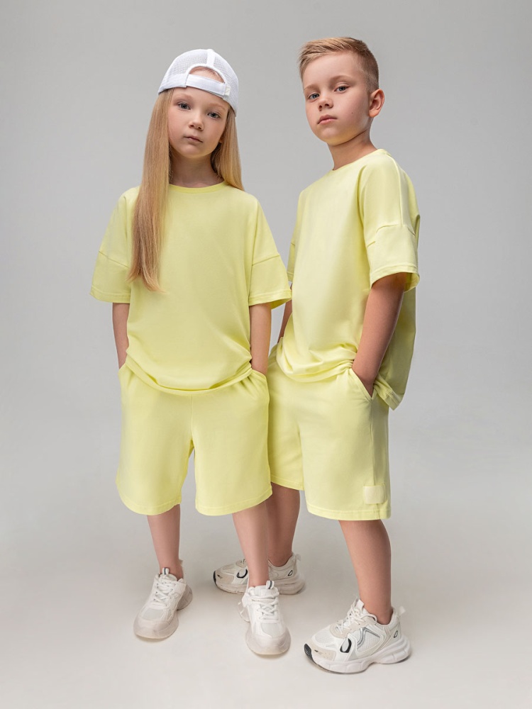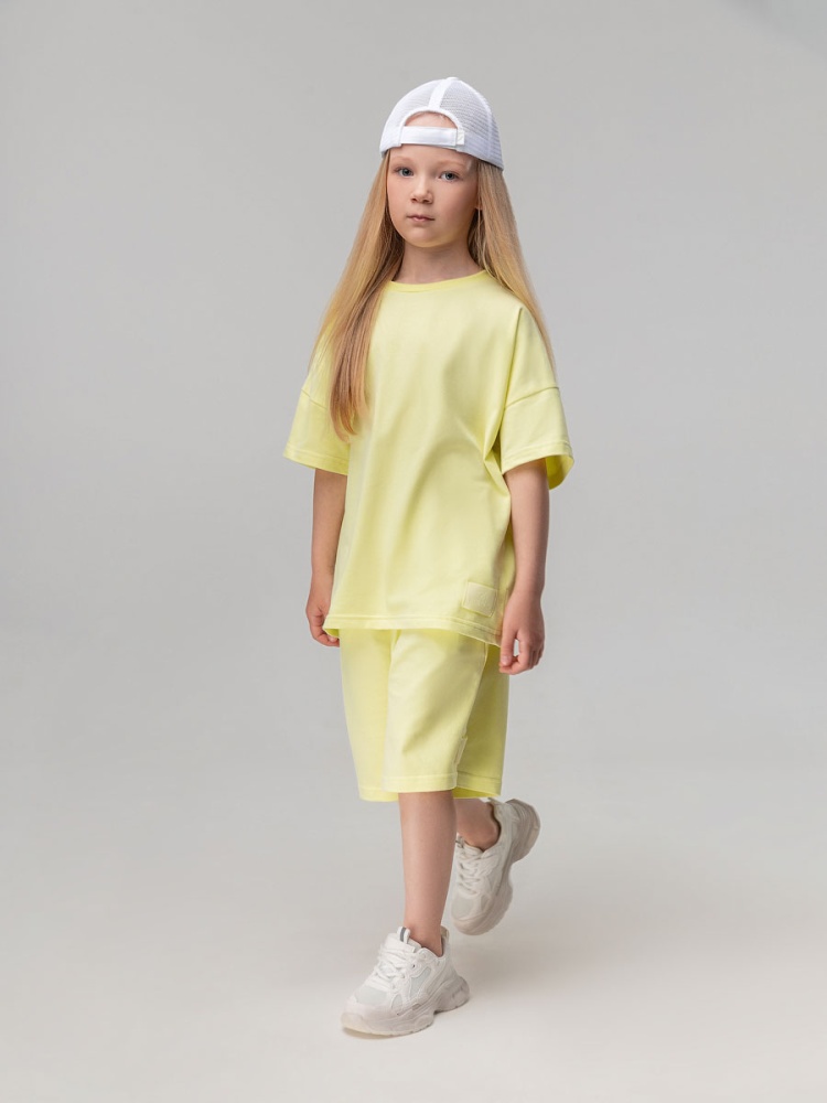 Материал кулирная гладь Состав 92% хлопок 8% лайкра Костюм с эффектом фрчи: футболка и шорты. Свободная футболка с коротким рукавом и прямые шорты с боковыми карманами, пояс на резинке.