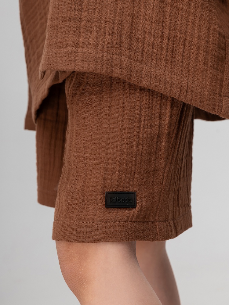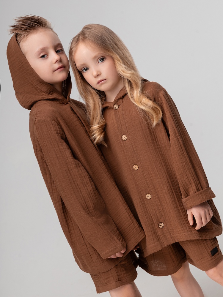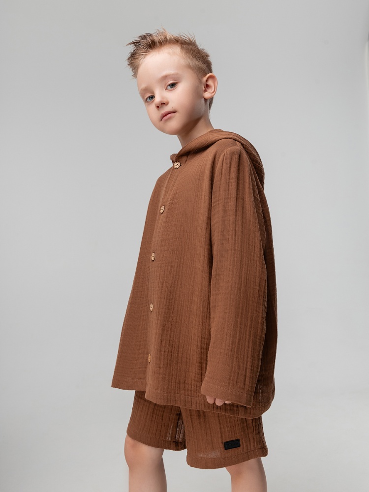 Материал муслин Состав 100% хлопок Муслиновый костюм: рубашка и шорты. Рубашка на пуговицах с длинными рукавами и капюшоном. Свободные шорты, пояс на резинке, без карманов.