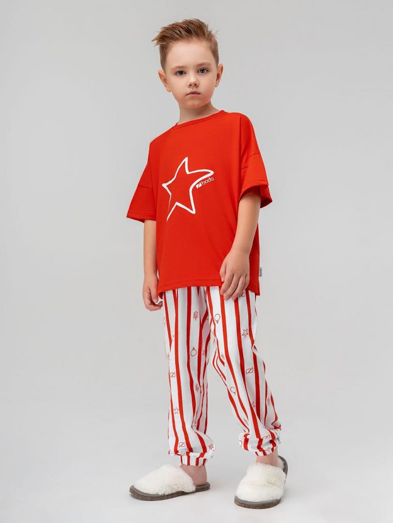 Артикул 11-642MU Материал кулирная гладь Состав 100% хлопок Костюм: футболка и брюки. Футболка свободного силуэта с коротким рукавом. Горловина футболки округлой формы. Низ изделия прямой. На полочке расположен принт "Звезда". Брюки свободного силуэта, без карманов, низ изделия на резинке.