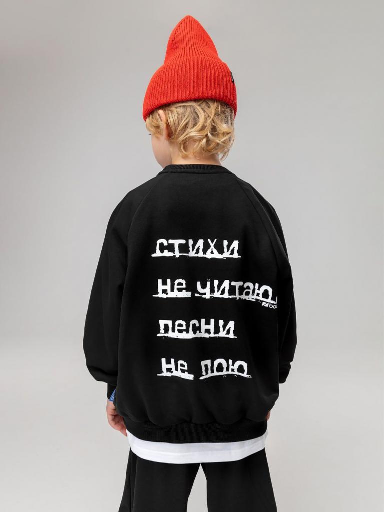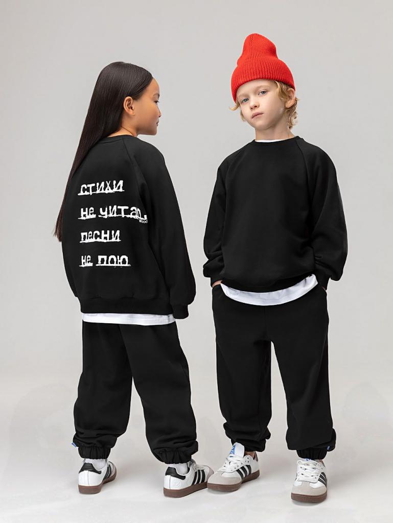 Артикул 11-649MU Материал футер трехнитка петля Состав 80% хлопок 20% полиэстер Костюм: свитшот и брюки. Свитшот прямого силуэта, с длинным рукавом на манжете. Свитшот с поясом по низу изделия. На спинке принт "Стихи не читаю Песни не пою" . Свободные брюки на поясе с внутренней резинкой. Низ брюк с манжетой на резинке. Брюки с боковыми карманами.