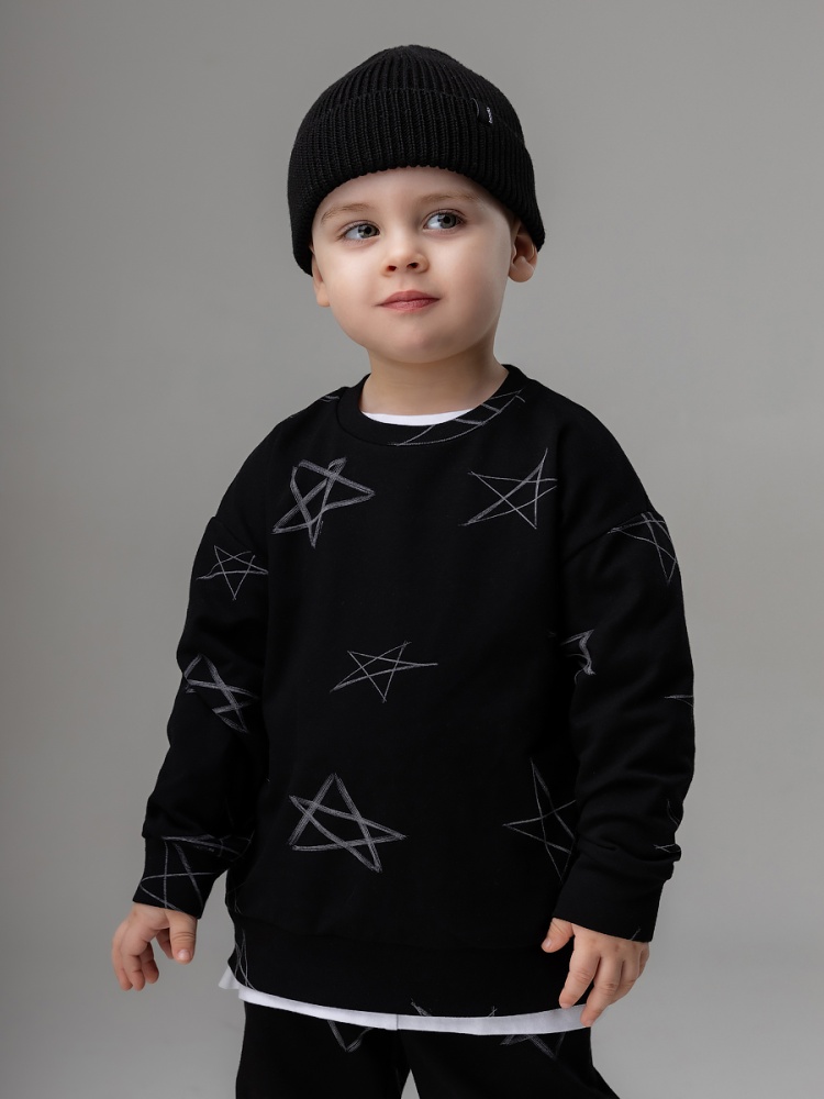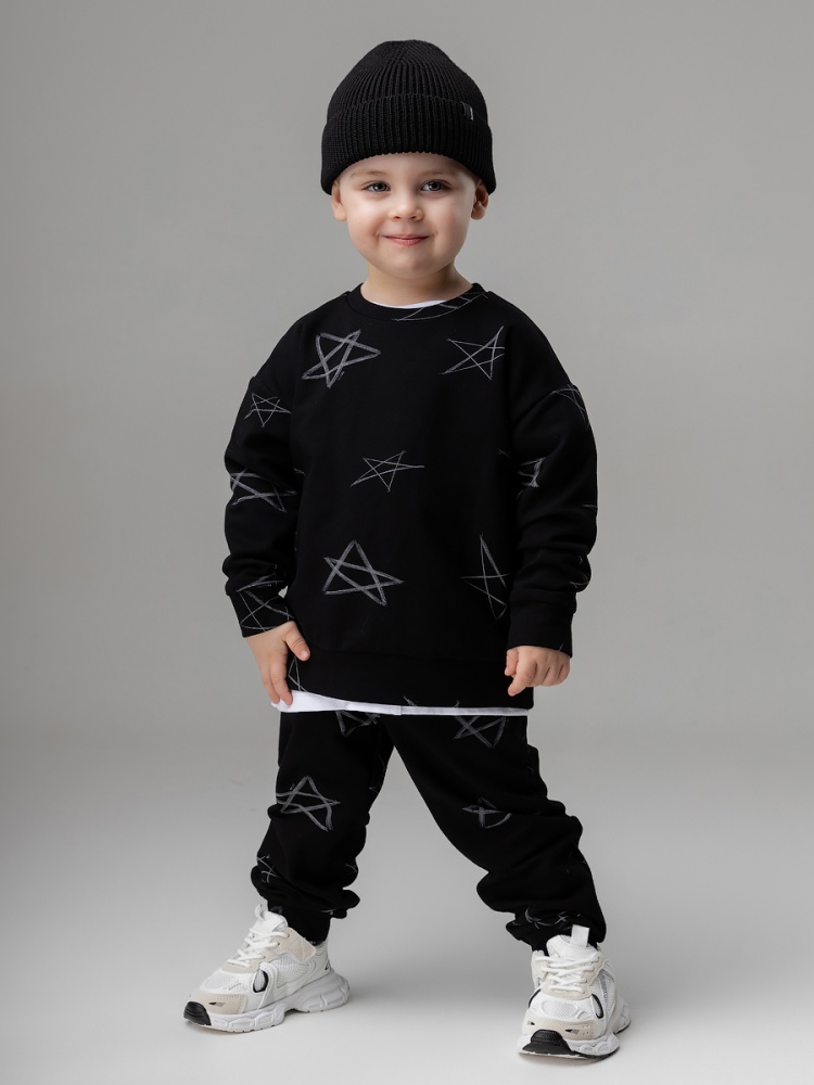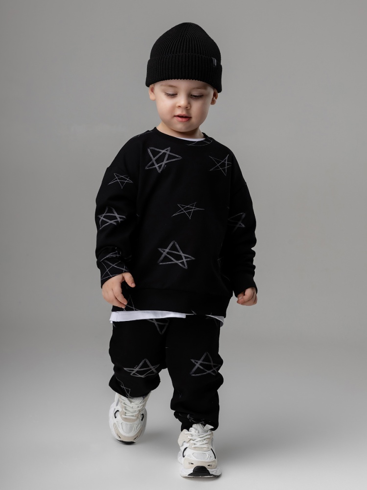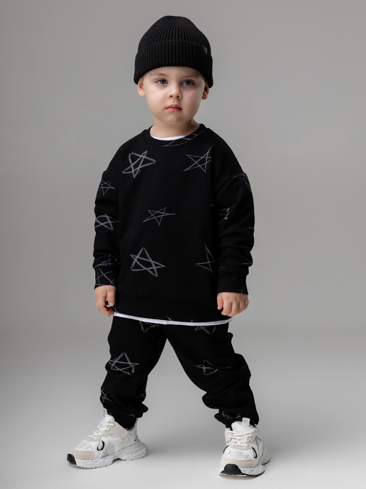 Артикул 21-127MU Материал футер двухнитка Состав 92% хлопок 8% лайкра Костюм для детей ясельного возраста. Толстовка без подкладки, прямого силуэта, с притачным поясом по низу изделия, со спущенным плечом и втачными рукавами с притачной манжетой. Горловина округлой формы. Брюки прямые на притачном поясе с внутренней резинкой. Брюки с манжетой.