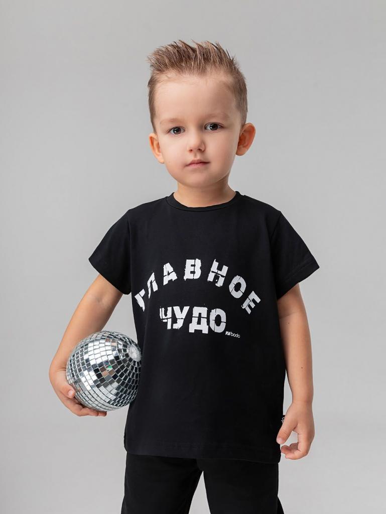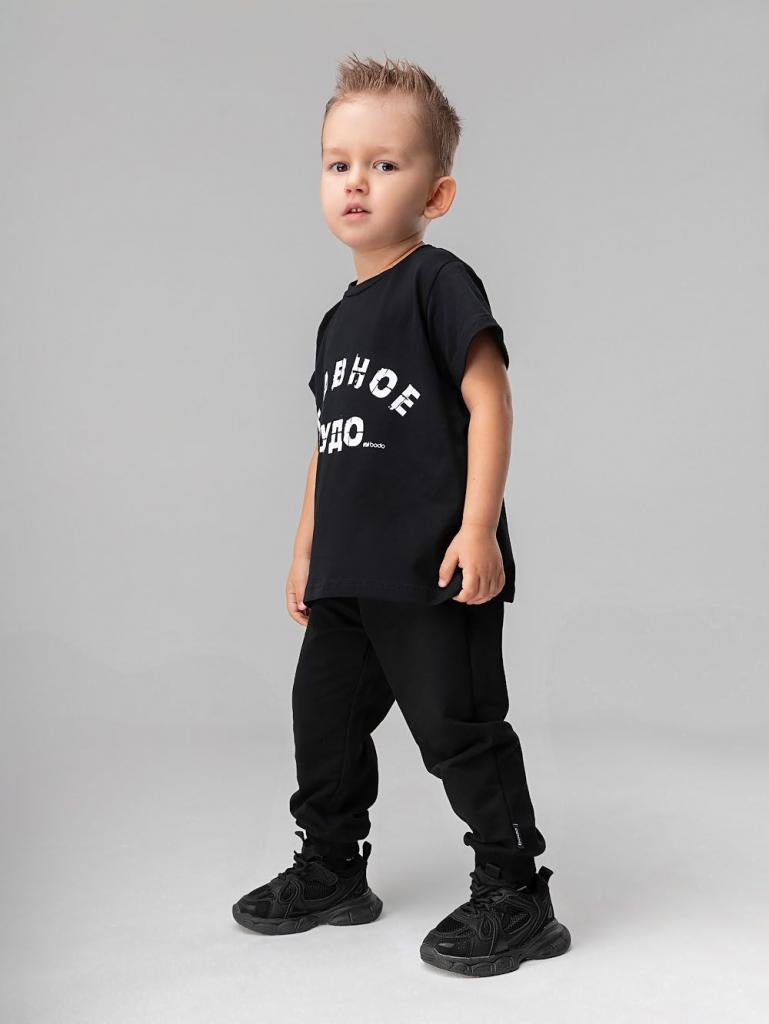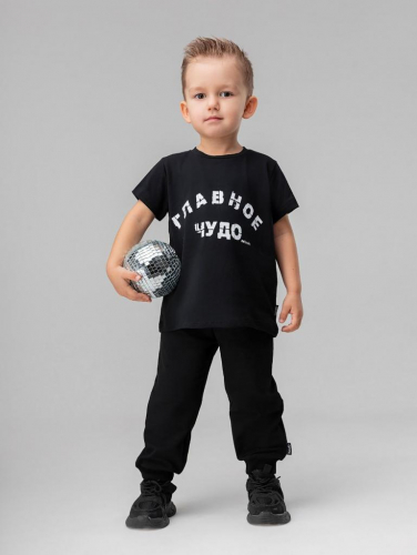 Артикул 21-133MU Материал кулирная гладь Состав 92% хлопок 8% лайкра Костюм: футболка и брюки. Прямая футболка с принтом "Главное чудо". Горловина округлой формы. Низ изделия прямой. Брюки прямые на поясе с внутренней резинкой. Брюки с манжетой.