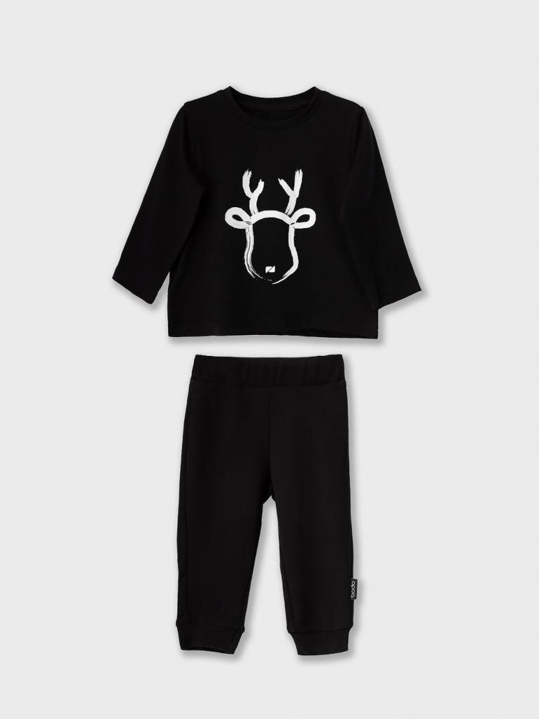 Артикул 21-134MU Материал кулирная гладь Состав 92% хлопок 8% лайкра Костюм: лонгслив и брюки. Лонгслив прямой с длинными рукавами. Горловина округлой формы. Низ изделия прямой. На полочке печать "Олень". Брюки прямые на поясе с внутренней резинкой. Брюки с манжетой.
