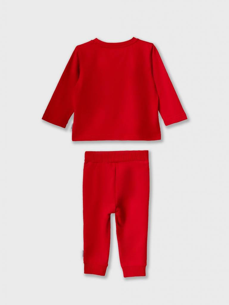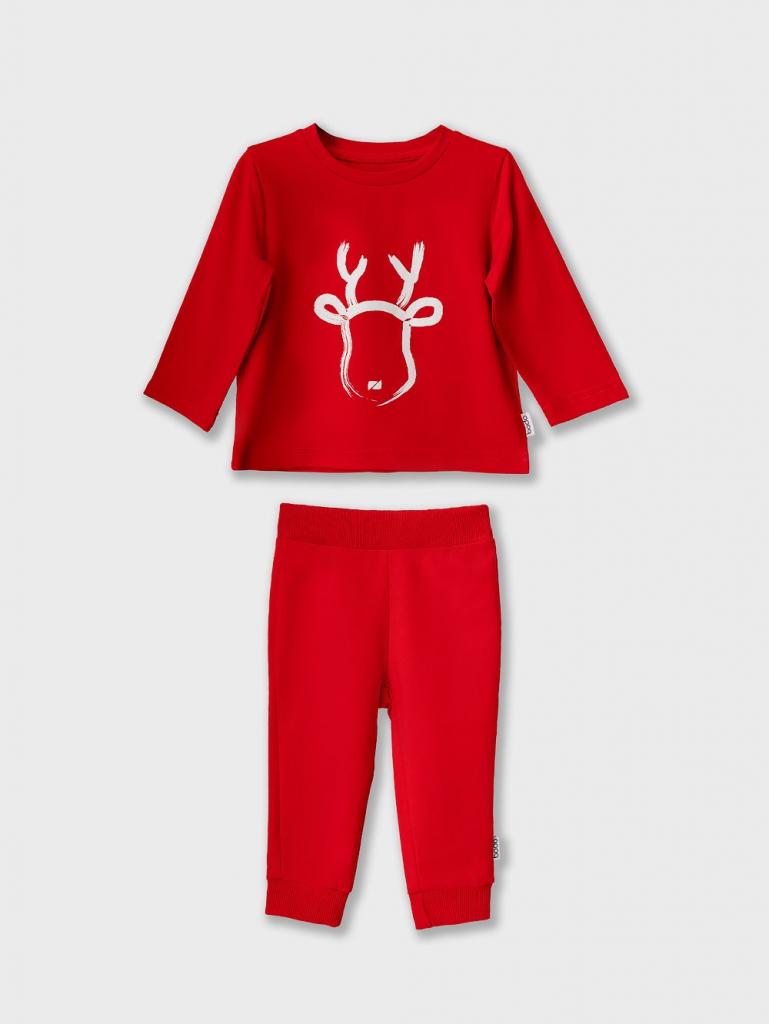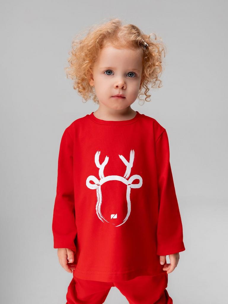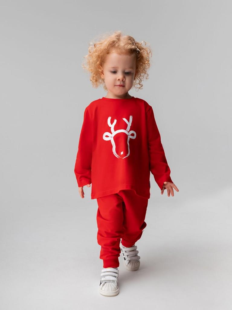 Артикул 21-134MU Материал кулирная гладь Состав 92% хлопок 8% лайкра Костюм: лонгслив и брюки. Лонгслив прямой с длинными рукавами. Горловина округлой формы. Низ изделия прямой. На полочке печать "Олень". Брюки прямые на поясе с внутренней резинкой. Брюки с манжетой.