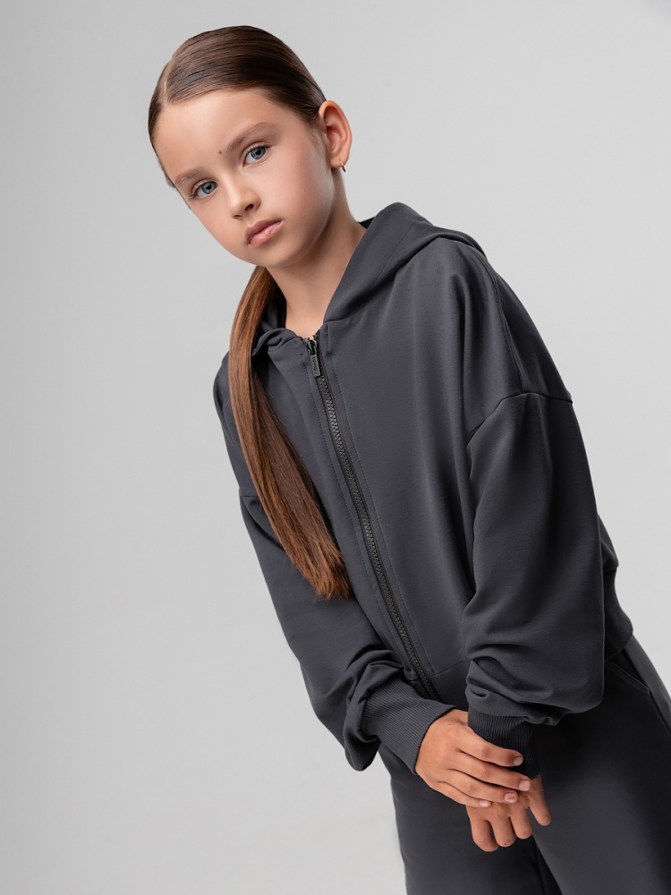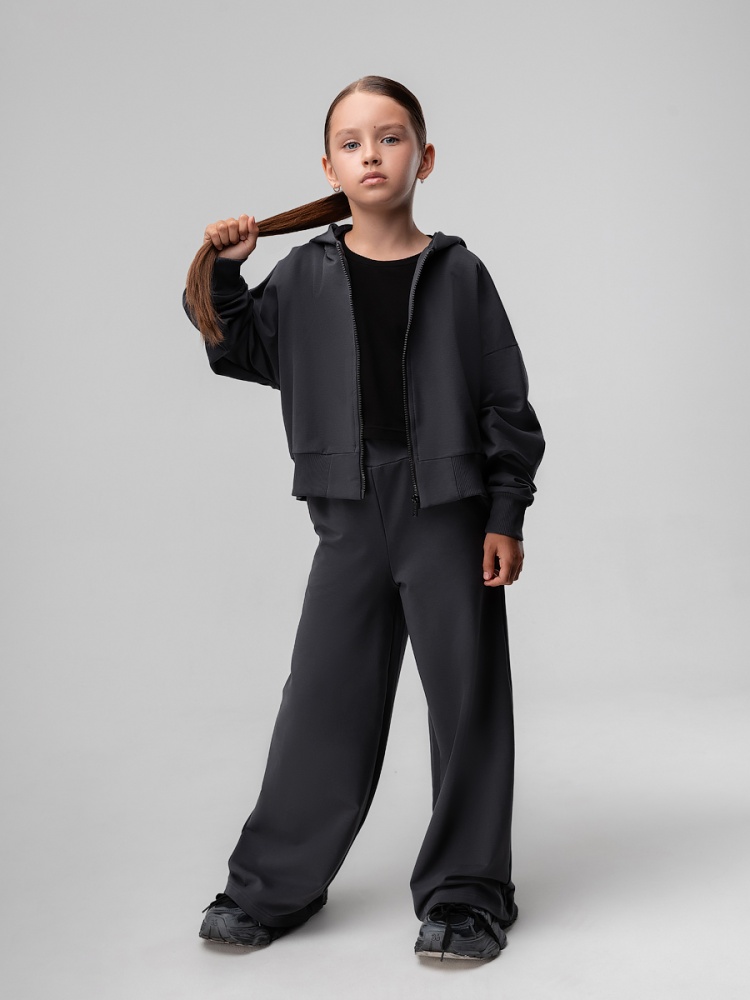 Материал футер двухнитка Состав 92% хлопок 8% лайкра Костюм для детей школьного возраста.Толстовка прямого силуэта, укороченная, с центральной бортовой застёжкой на тесьму молния, на притачном поясе по низу изделия, со спущенным плечом, с втачными рукавами с притачной манжетой, с втачным капюшоном. Брюки свободные, расширенные к низу, на притачном поясе с внутренней резинкой, с боковыми карманами.
