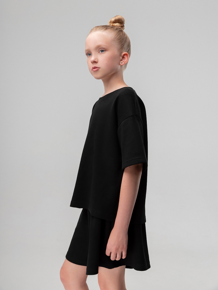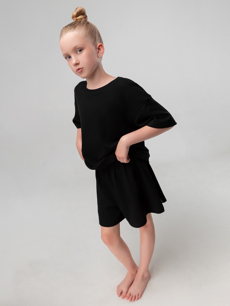 Материал кулирная гладь Состав 92% хлопок 8% лайкра Костюм летний из вафельной кулирки: футболка и шорты. Свободная футболка, слегка укорочена, с коротким рукавом.Шорты свободного кроя, пояс с внутренней резинкой.