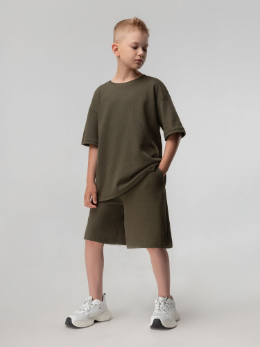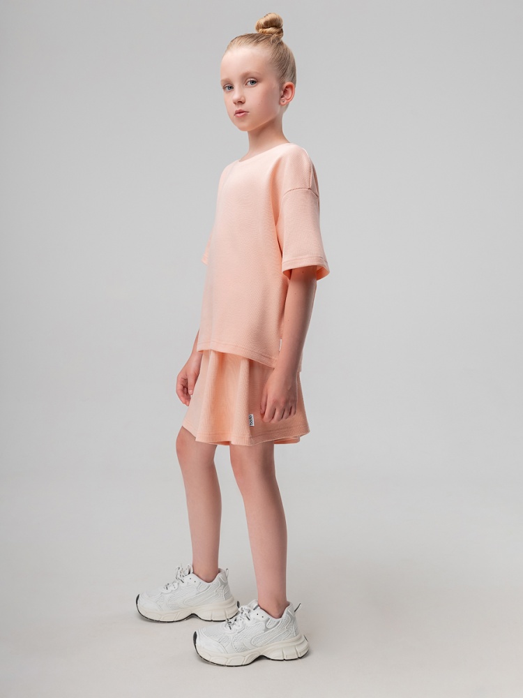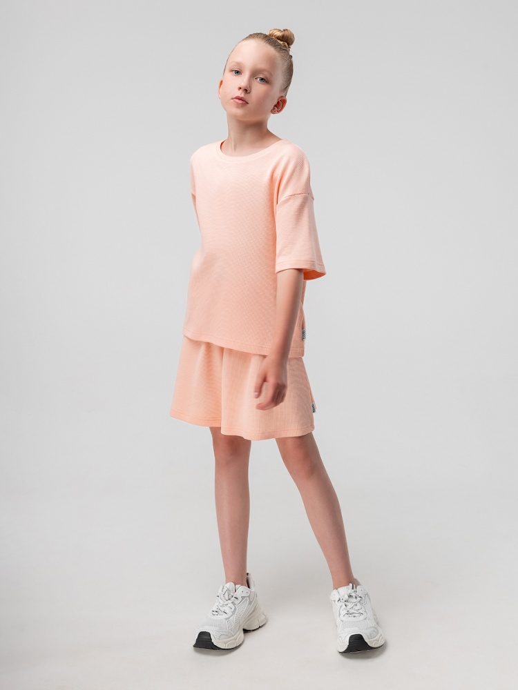 Материал кулирная гладь Состав 92% хлопок 8% лайкра Костюм летний из вафельной кулирки: футболка и шорты. Свободная футболка, слегка укорочена, с коротким рукавом.Шорты свободного кроя, пояс с внутренней резинкой.