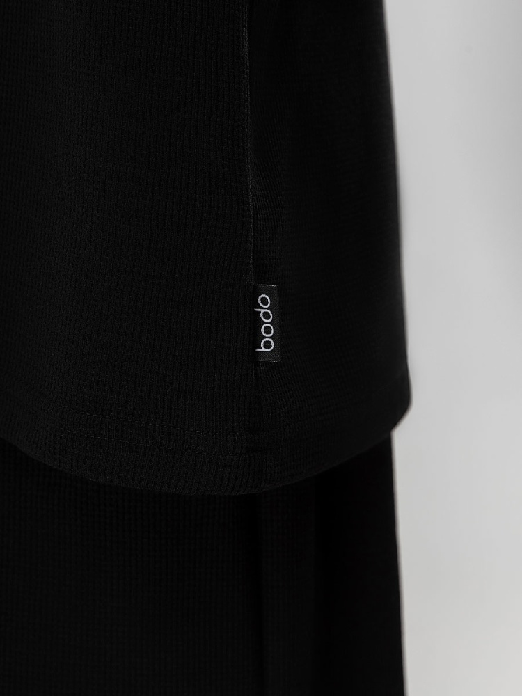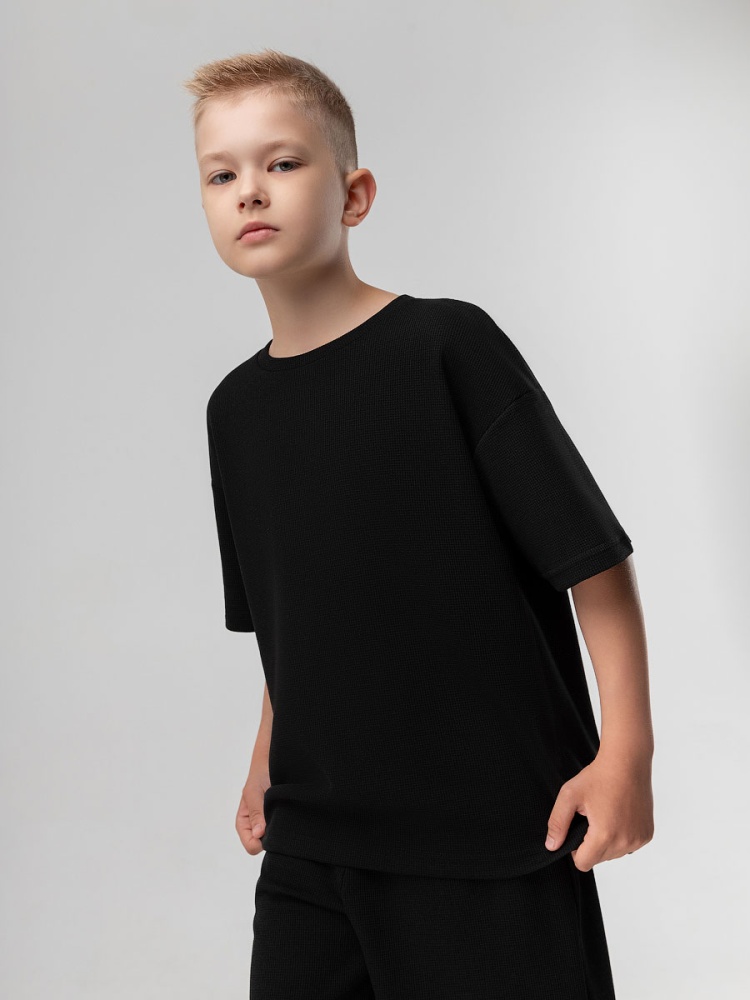 Материал кулирная гладь Состав 92% хлопок 8% лайкра Костюм из вафельной кулирки: футболка и шорты. Свободная футболка с коротким рукавом. Свободные, прямые шорты с боковыми карманами.
