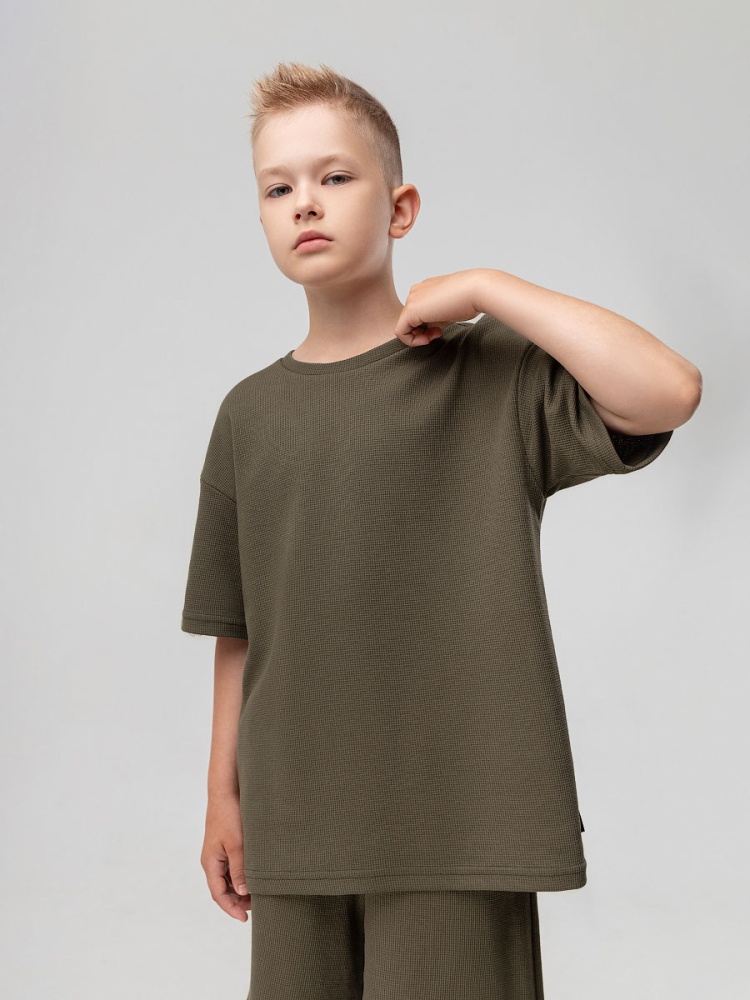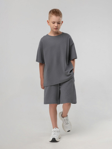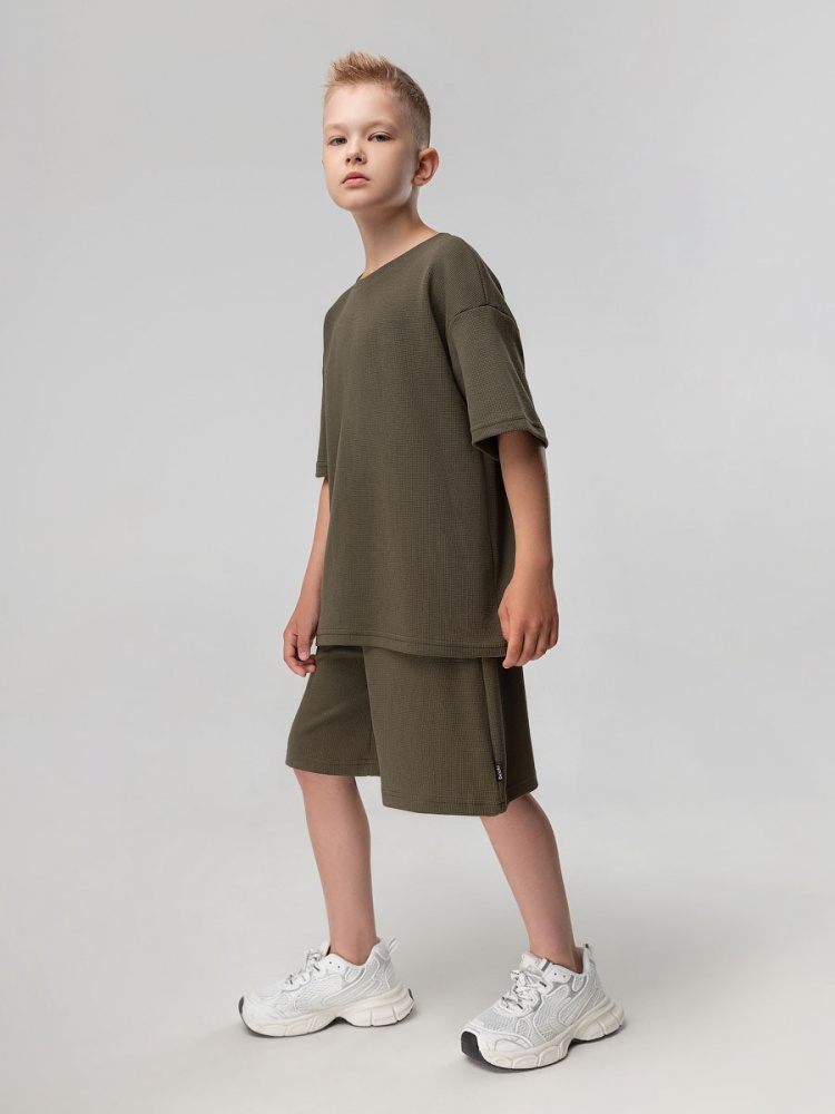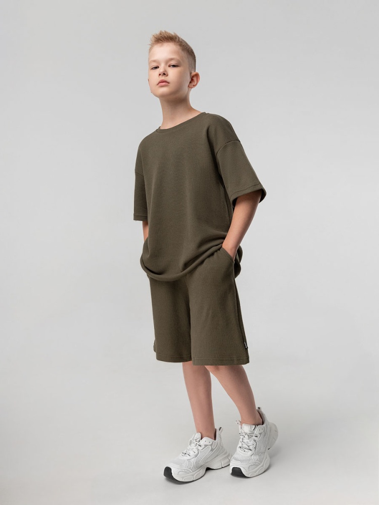 Материал кулирная гладь Состав 92% хлопок 8% лайкра Костюм из вафельной кулирки: футболка и шорты. Свободная футболка с коротким рукавом. Свободные, прямые шорты с боковыми карманами.