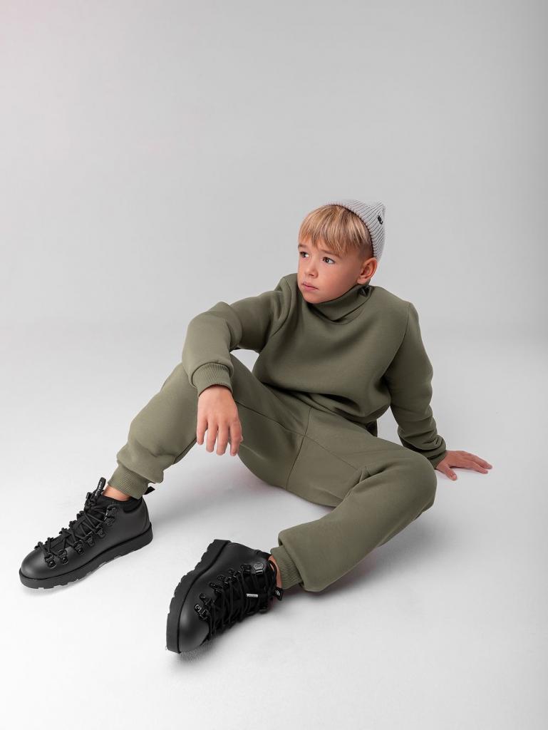 Артикул 46-91МU Материал футер трехнитка с начесом Состав 80% хлопок 20% полиэстер Костюм с начесом: водолазка и брюки. Водолазка без подкладки, на поясе по низу изделия, с воротником - стойка. Прямые свободные брюки на поясе с внутренней резинкой, по низу изделия на манжете. С боковыми карманами.