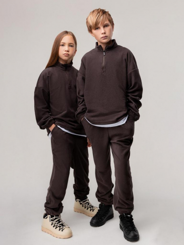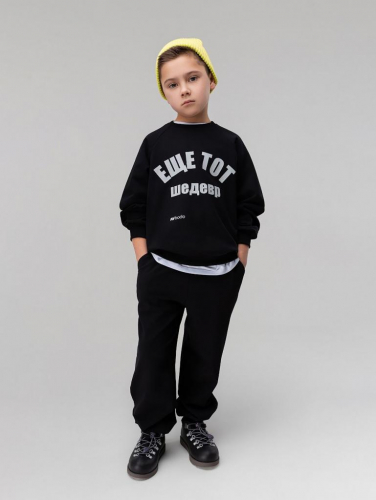 Артикул 11-657MU Состав 92% хлопок 8% лайкра Материал футер двухнитка Костюм: свитшот и брюки. Прямой, свободный свитшот, по плечу и рукаву оформлена декоративной лентой с логотипом. Принт на полочке "ещё тот шедевр". Свитшот с поясом по низу изделия. Свободные. прямые брюки на поясе с резинкой. брюки с боковыми карманами.