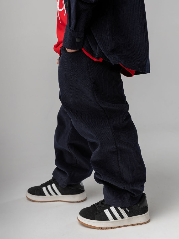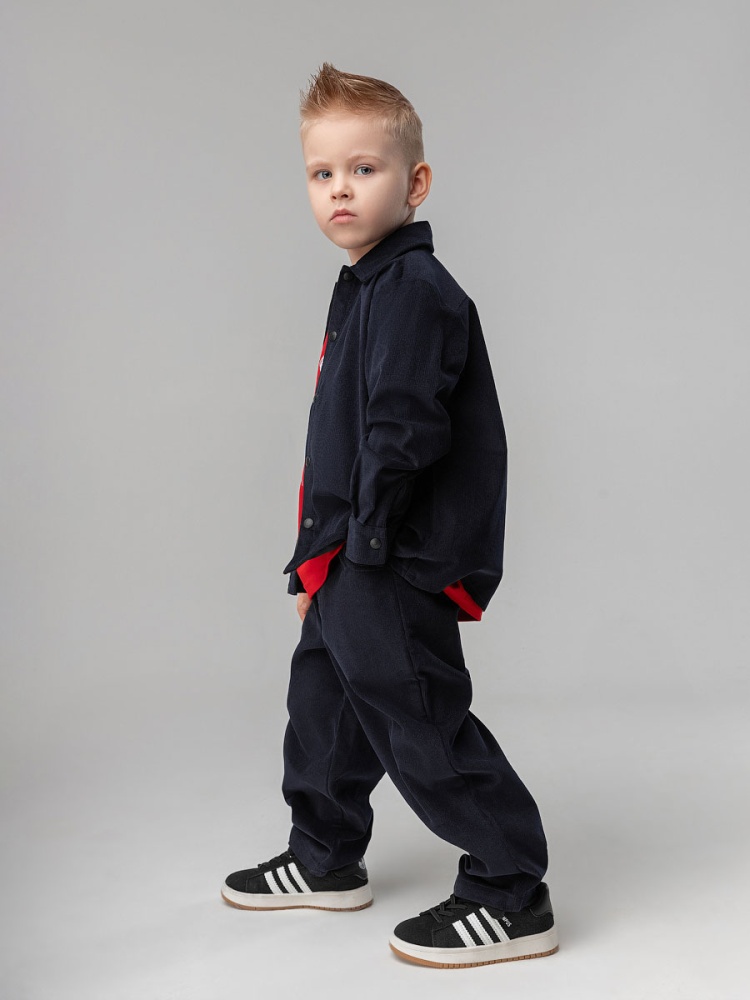 Материал микровельвет Состав 100% хлопок Костюм вельветовый: рубашка и брюки. Прямая рубашка без подкладки, с застёжкой на кнопки, с отложным воротником. Рукава с манжетой на кнопке. Свободные брюки, расширенные в бёдрах и заужены к низу, пояс на резинке, брюки с боковыми карманами.