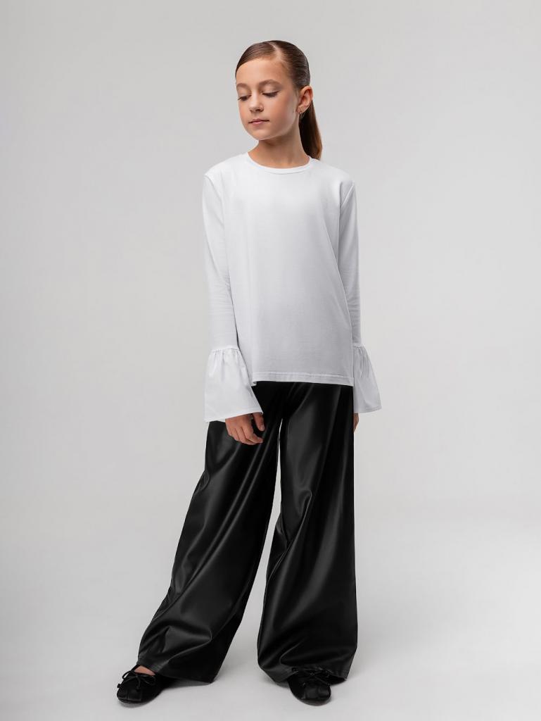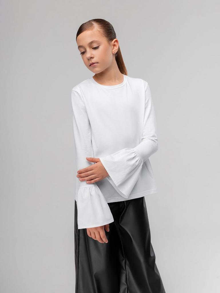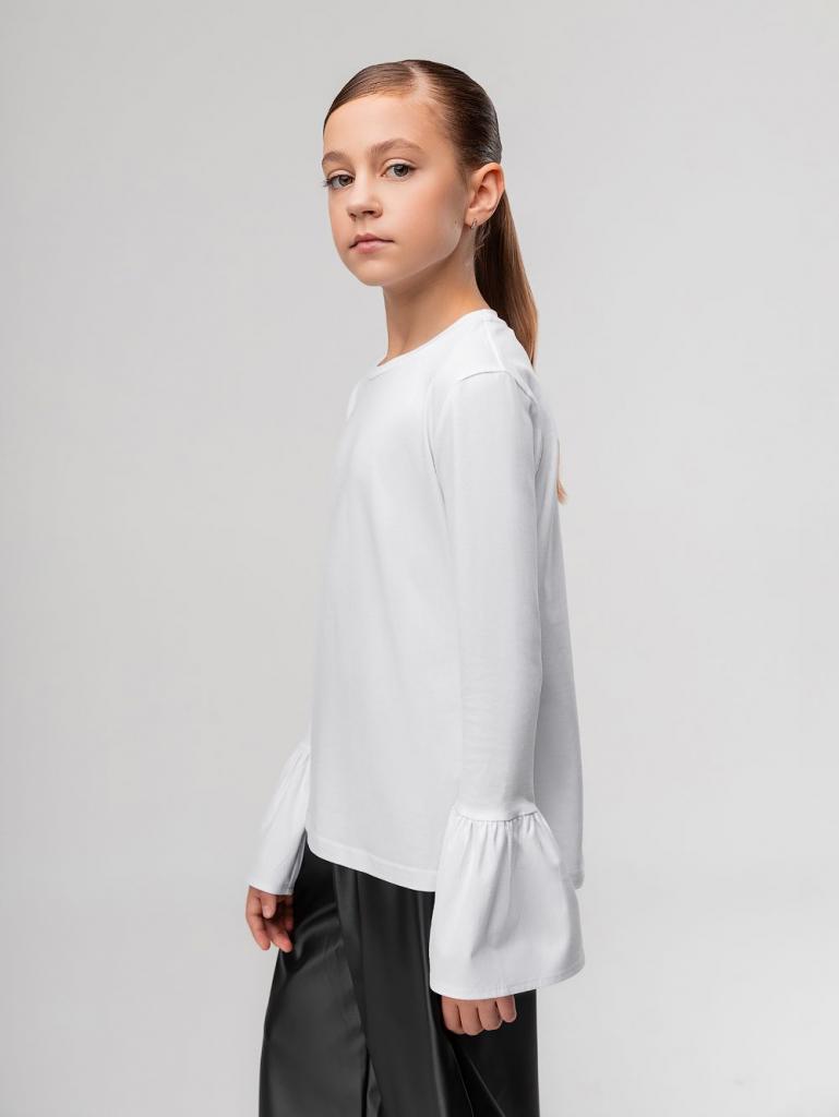 Артикул 42-55MU Материал кулирная гладь Состав 92% хлопок 8% лайкра Лонгслив свободного силуэта с длинным рукавом, низ рукава оформлен воланам. Горловина футболки округлой формы. Низ изделия прямой.