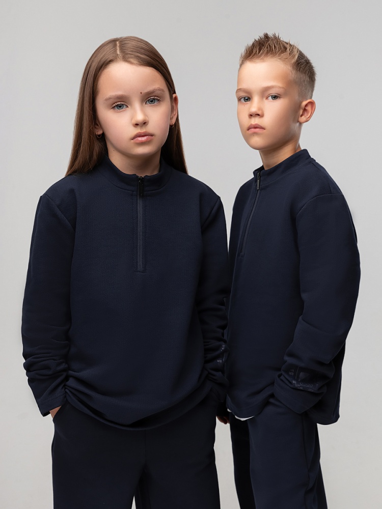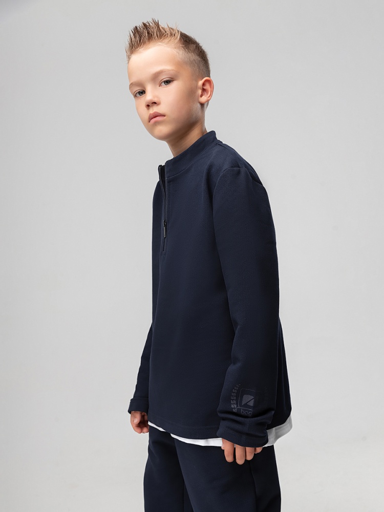 Материал футер двухнитка Состав 80% хлопок 20% полиэстер Лонгслив из материала пике прямого силуэта с длинным рукавом. Воротник стойка на молнии. На левом рукаве брендированный принт.