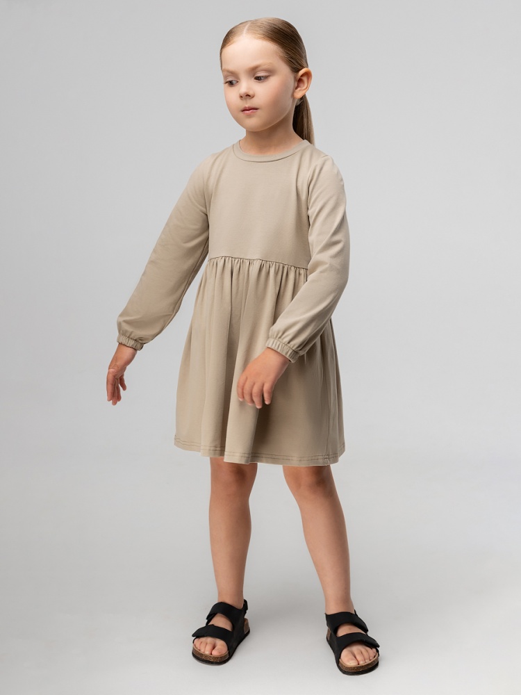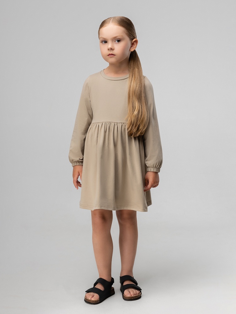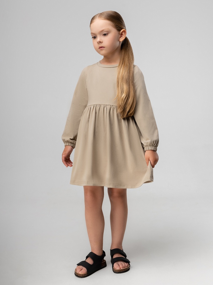 Материал кулирная гладь Состав 92% хлопок 8% лайкра Трапециевидное платье с длинными рукавами на резинке. Платье отрезное по линии талии, нижняя часть со сборкой. С карманами по бокам.