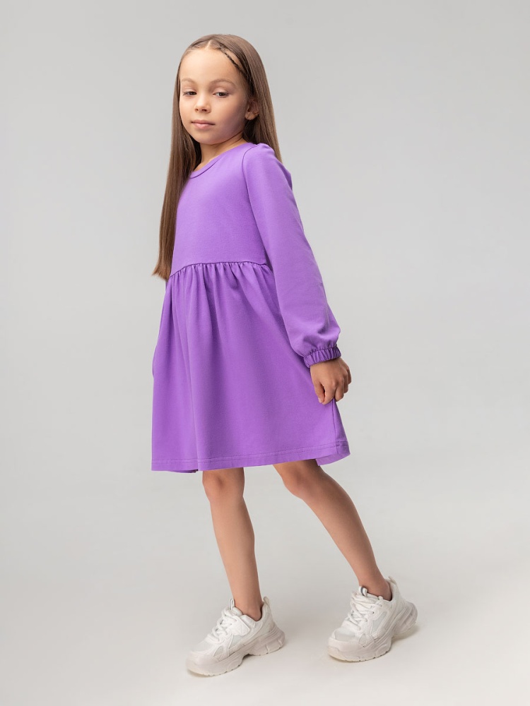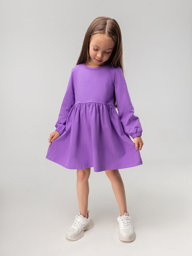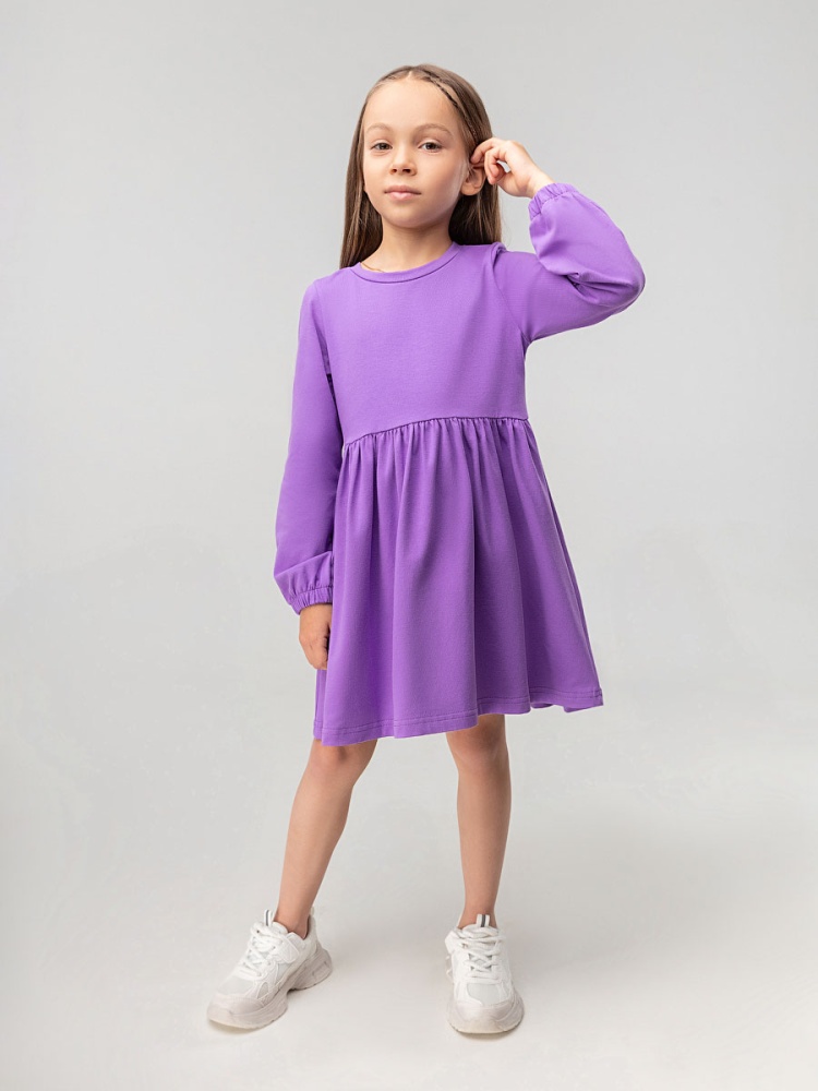 Материал кулирная гладь Состав 92% хлопок 8% лайкра Трапециевидное платье с длинными рукавами на резинке. Платье отрезное по линии талии, нижняя часть со сборкой. С карманами по бокам.
