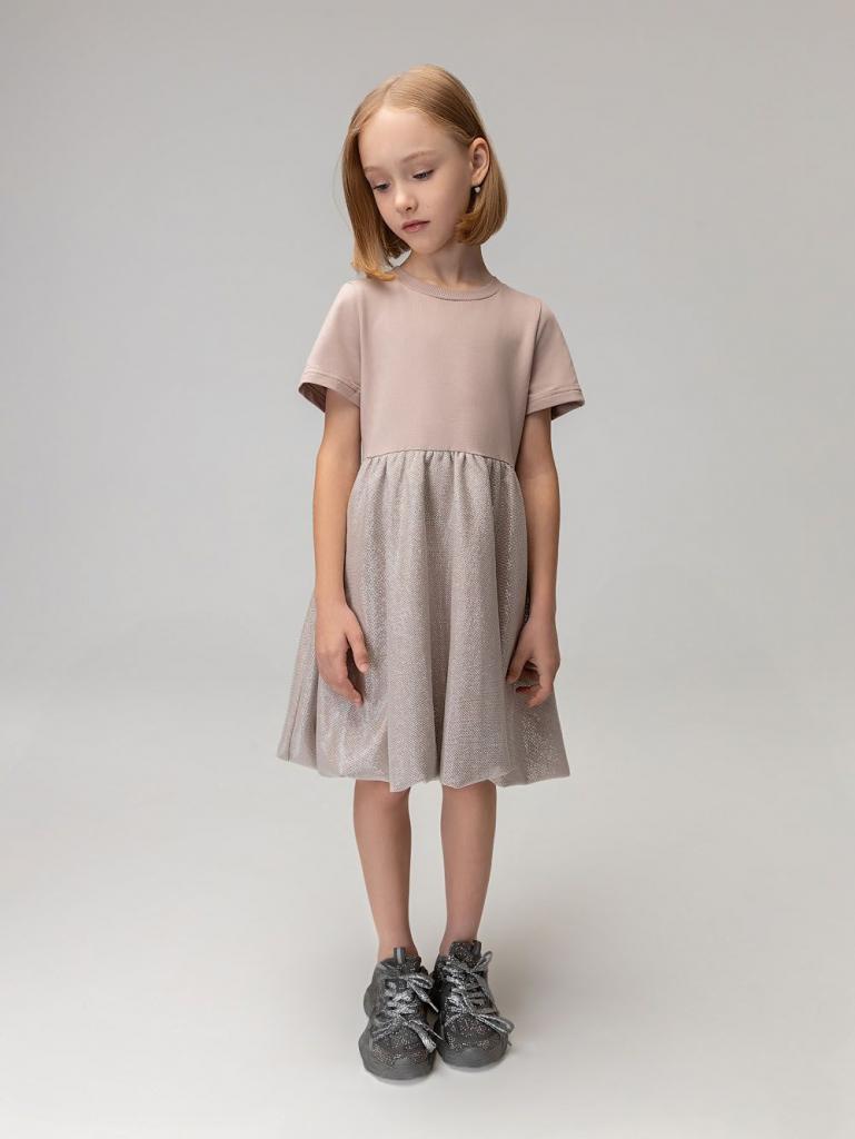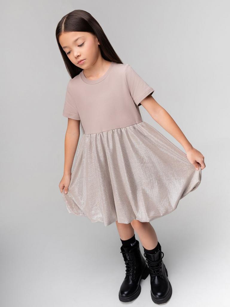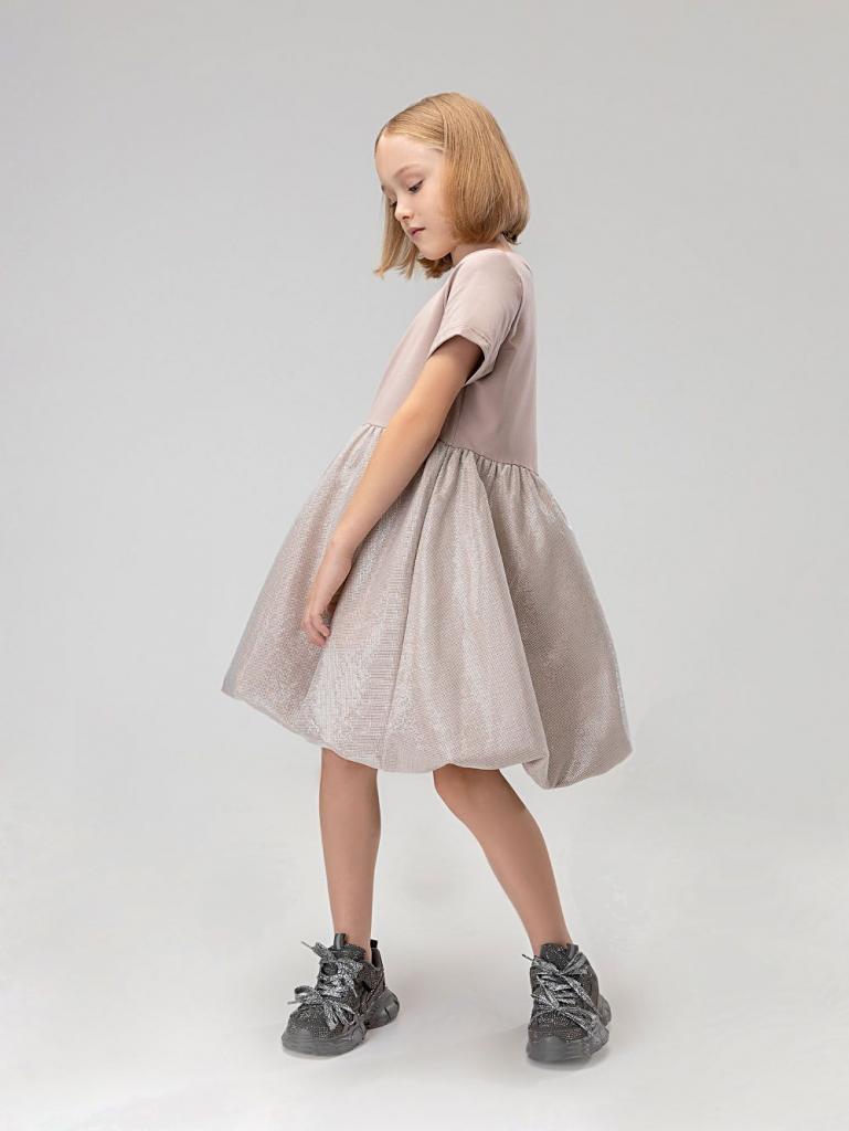 Артикул 18-190MD Материал футер двухнитка Состав 92% хлопок 8% лайкра Платье-баллон, низ из блестящего трикотажа с люрексом. Платье с коротким рукавом, отрезное по линии талии, нижняя часть со сборкой на подкладке, округлая горловина.
