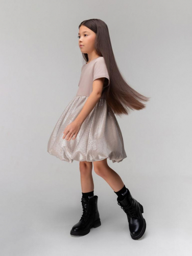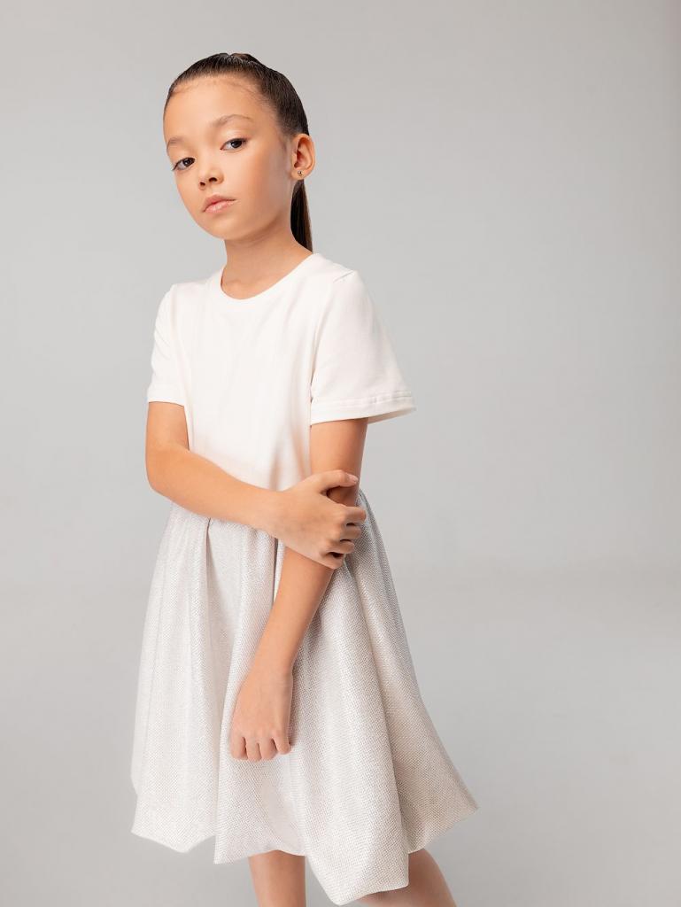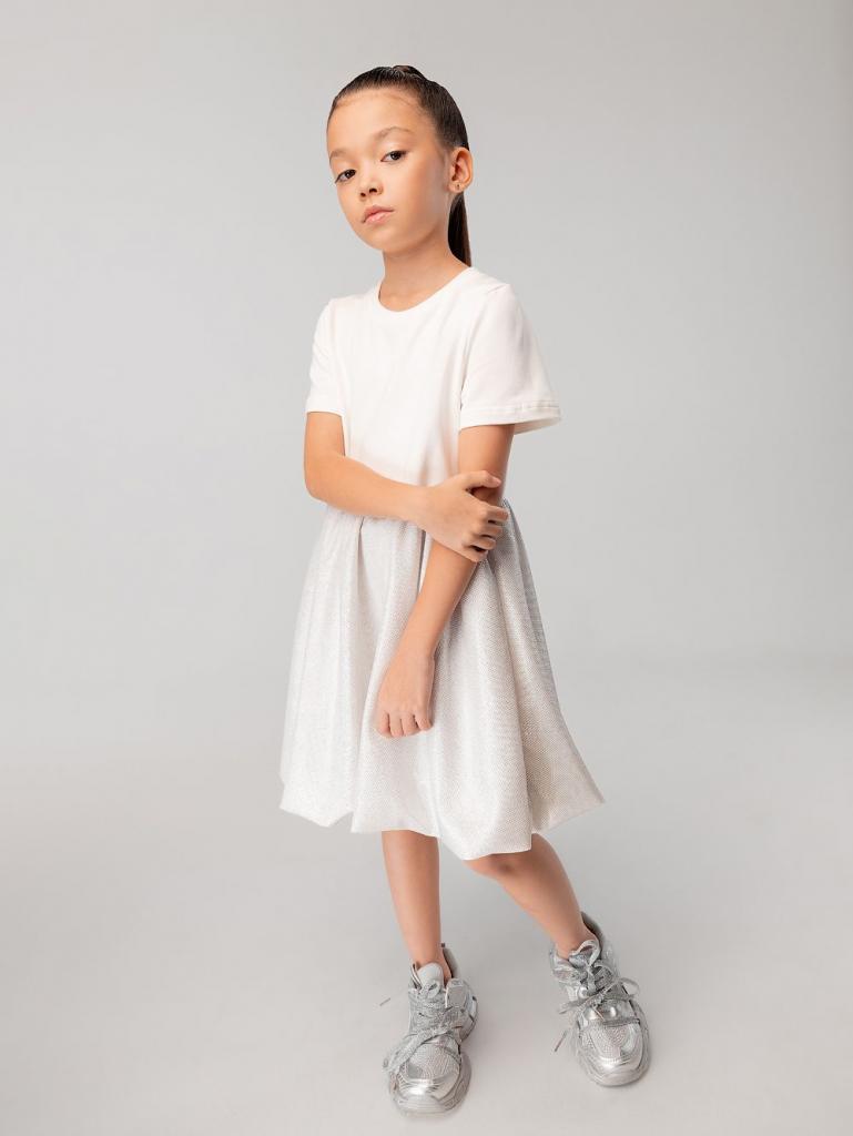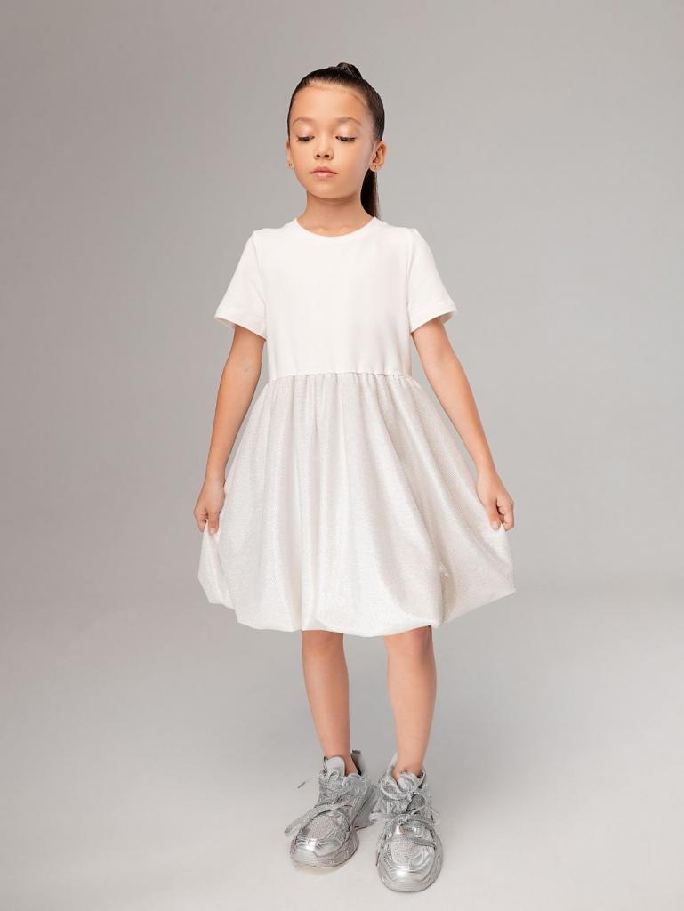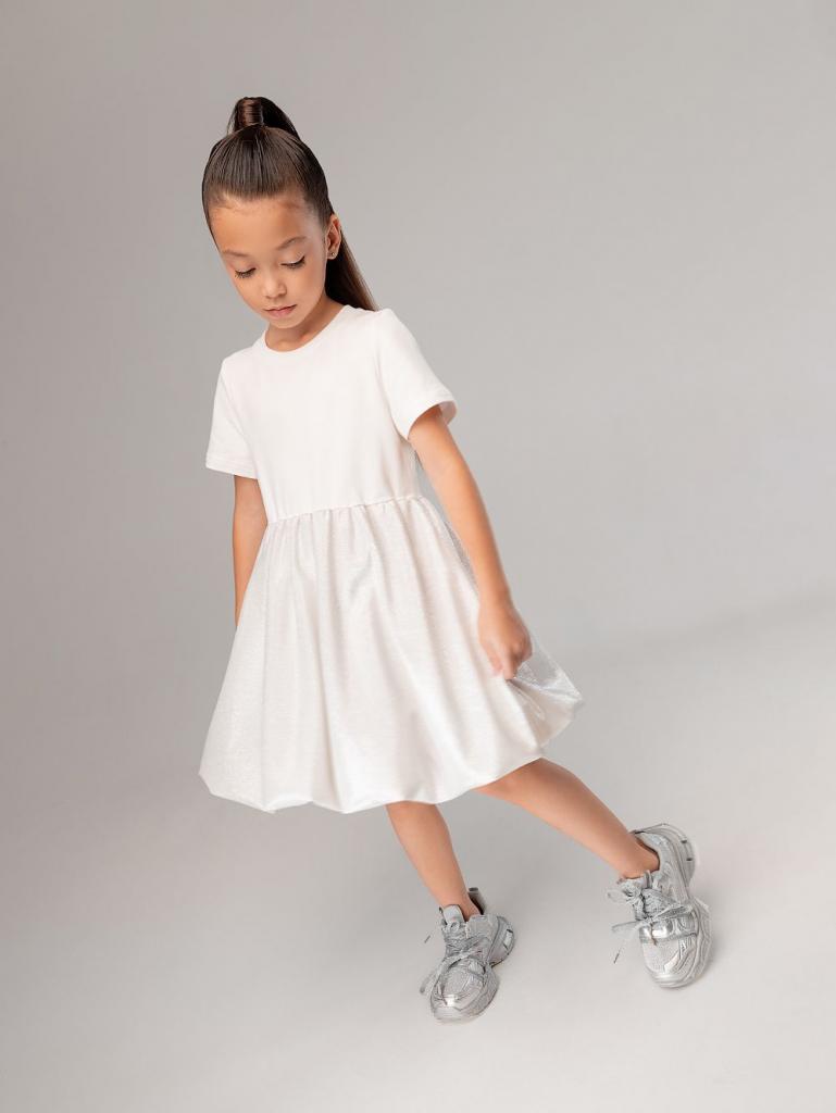 Артикул 18-190MD Материал футер двухнитка Состав 92% хлопок 8% лайкра Платье-баллон, низ из блестящего трикотажа с люрексом. Платье с коротким рукавом, отрезное по линии талии, нижняя часть со сборкой на подкладке, округлая горловина.