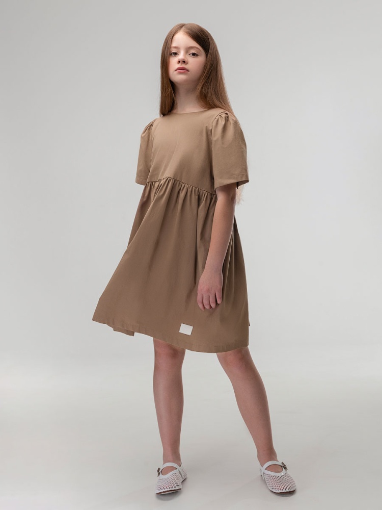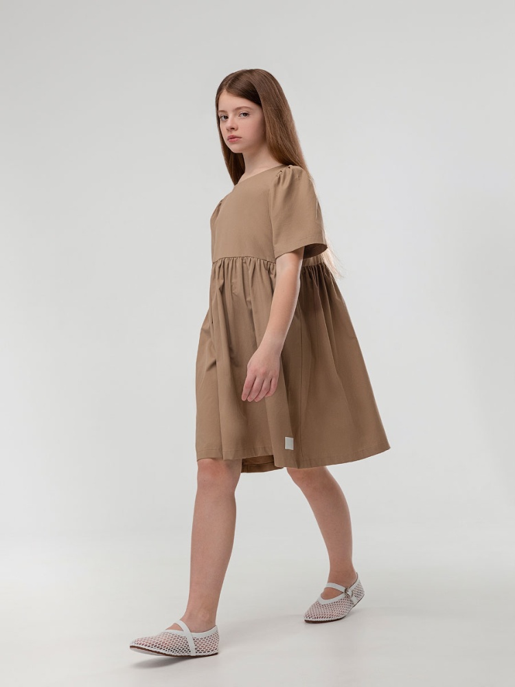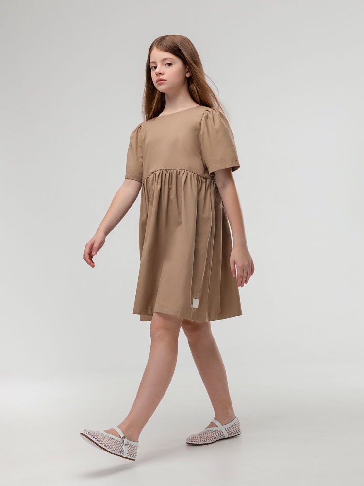 Материал рубашечная ткань Состав 55% хлопок 45% полиэстер Платье для девочек школьного возраста. Платье свободного силуэта, отрезное выше талии, нижняя часть со сборкой, низ изделия прямой. Платье с втачным коротким рукавом, горловина округлой формы, по спинке углублённый вырез.