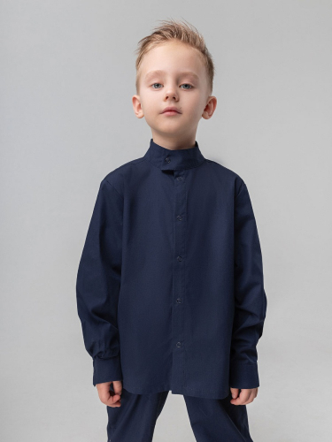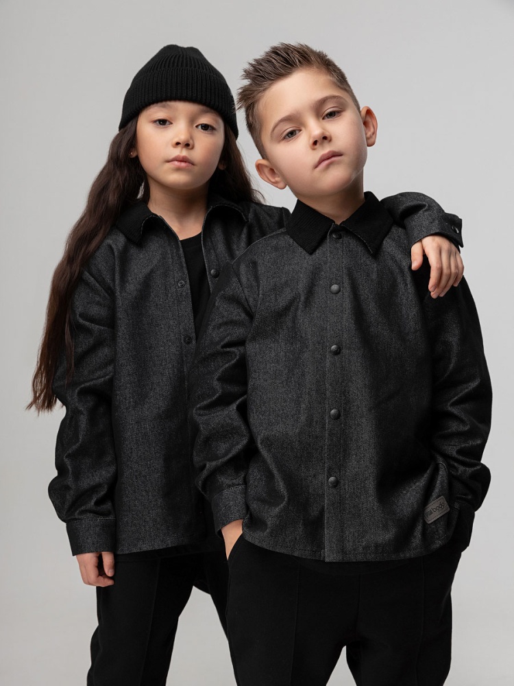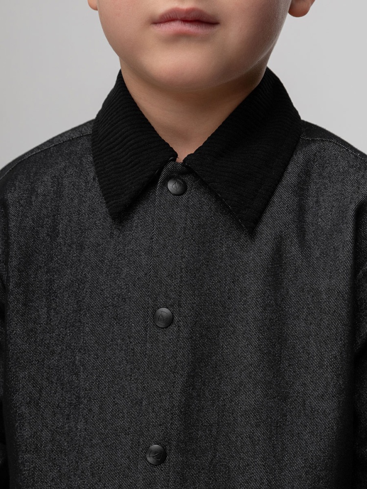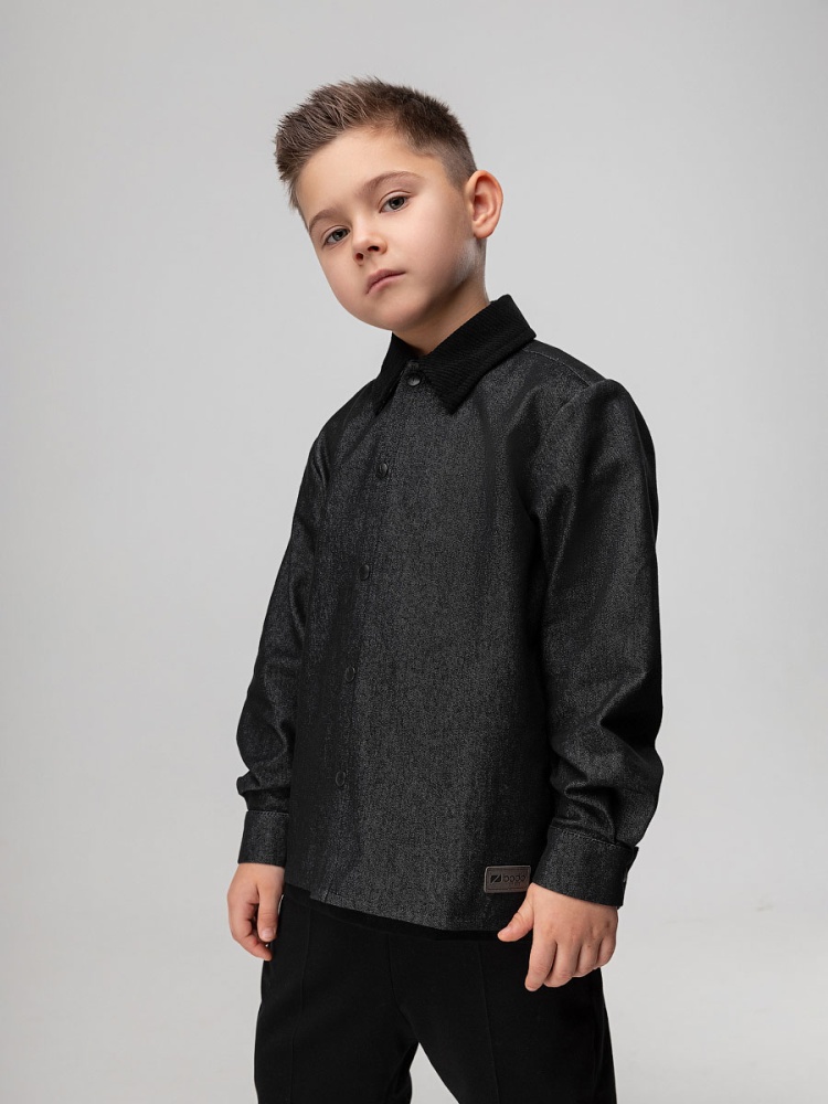 Материал джинсовая ткань Состав 80% хлопок 20% полиэстер Рубашка для детей дошкольного возраста. Рубашка без подкладки, прямого силуэта, с центральной бортовой застёжкой на кнопки, с отложным воротником из вельвета, с втачными рукавами с притачной манжетой на кнопке. Низ изделия прямой. По низу рукава — защипы. Джинсовая ткань 80% хлопок 20% полиэстер