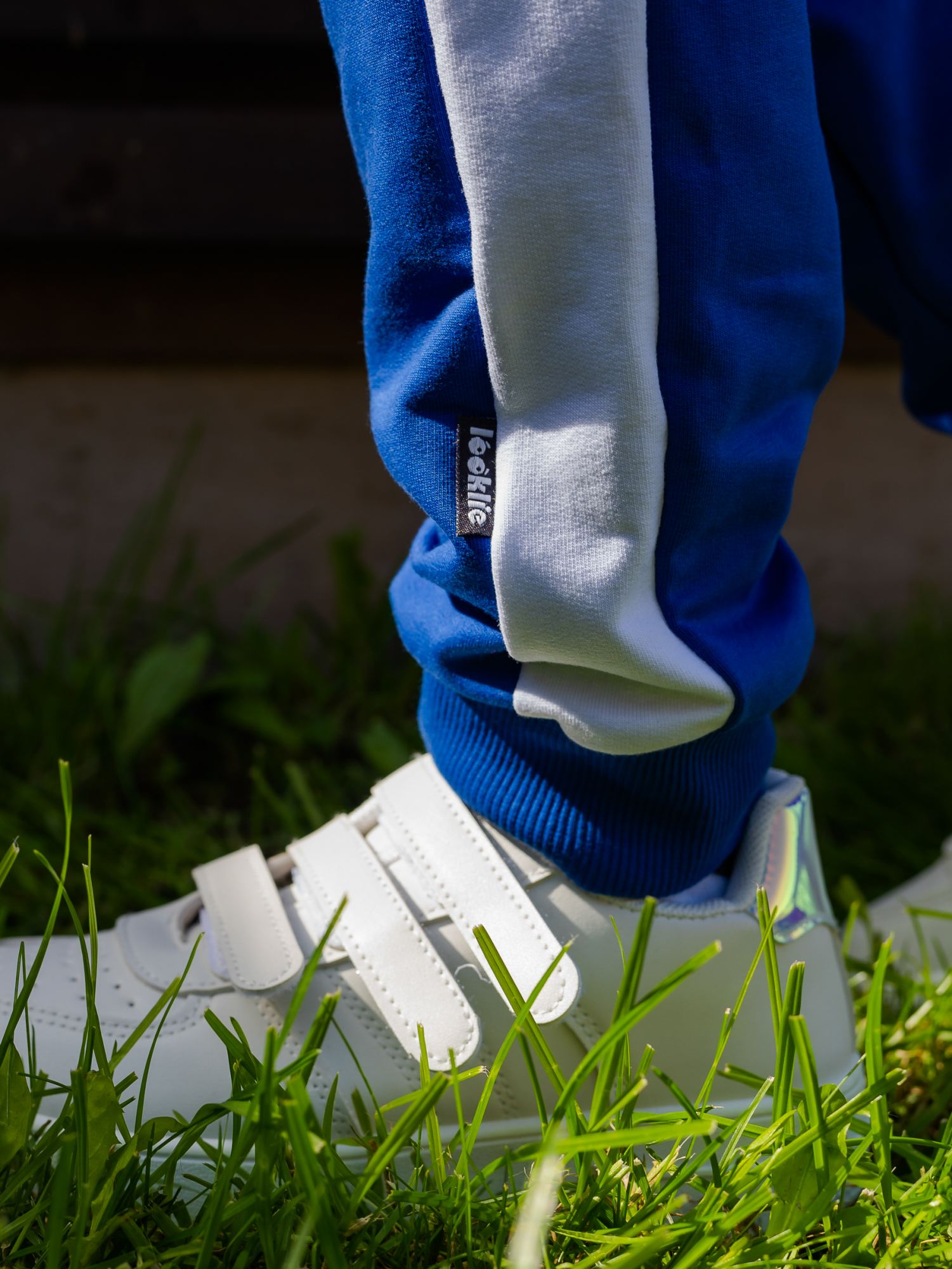 Брюки из футера василькового цвета с боковыми карманами, с широкими лампасами из отделочного полотна. Пояс на эластичной резинке. Низ брюк на манжетах. Изделие выполнено из трикотажа премиального качества - ПЕНЬЕ, с содержанием хлопка более 92%