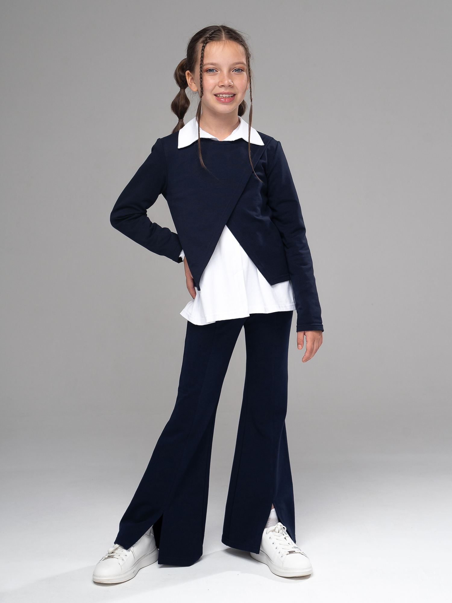 Стильные брюки-клеш из джерси темно-синего цвета для девочки, облегающие по бедрам и расклешенные от колена. Спереди по центру - рельефный шов с элегантным разрезом внизу. Пояс на эластичной резинке.