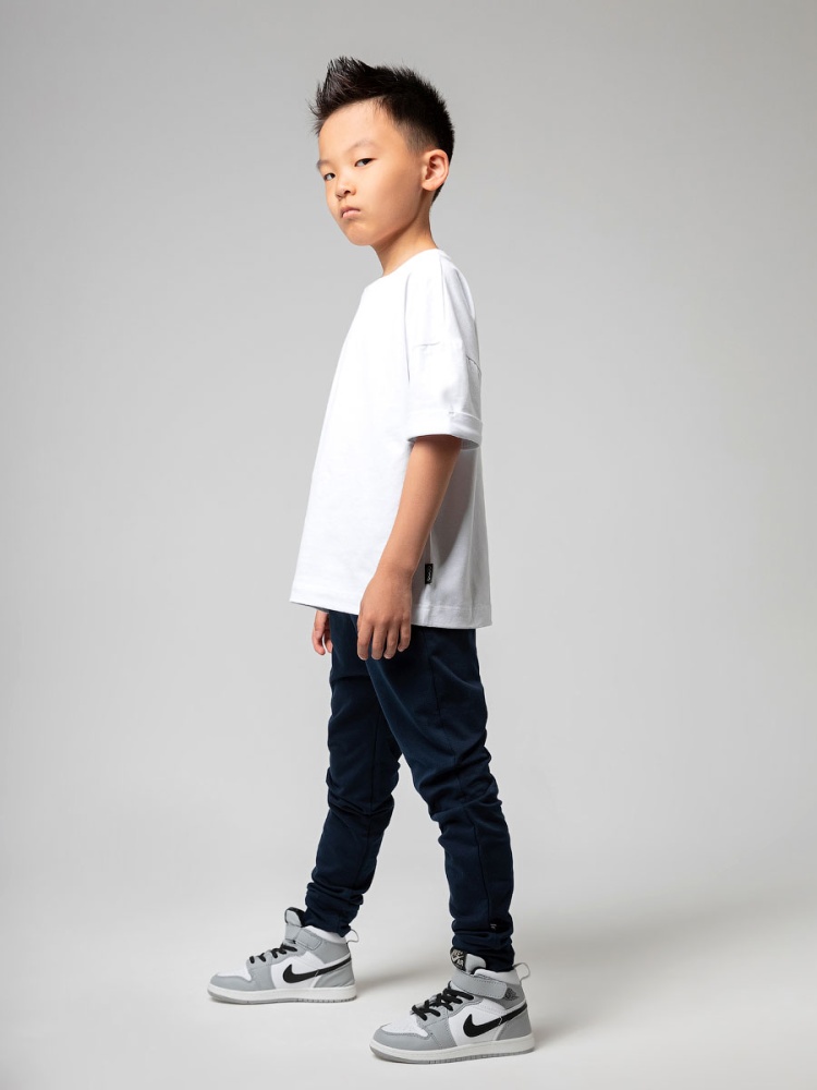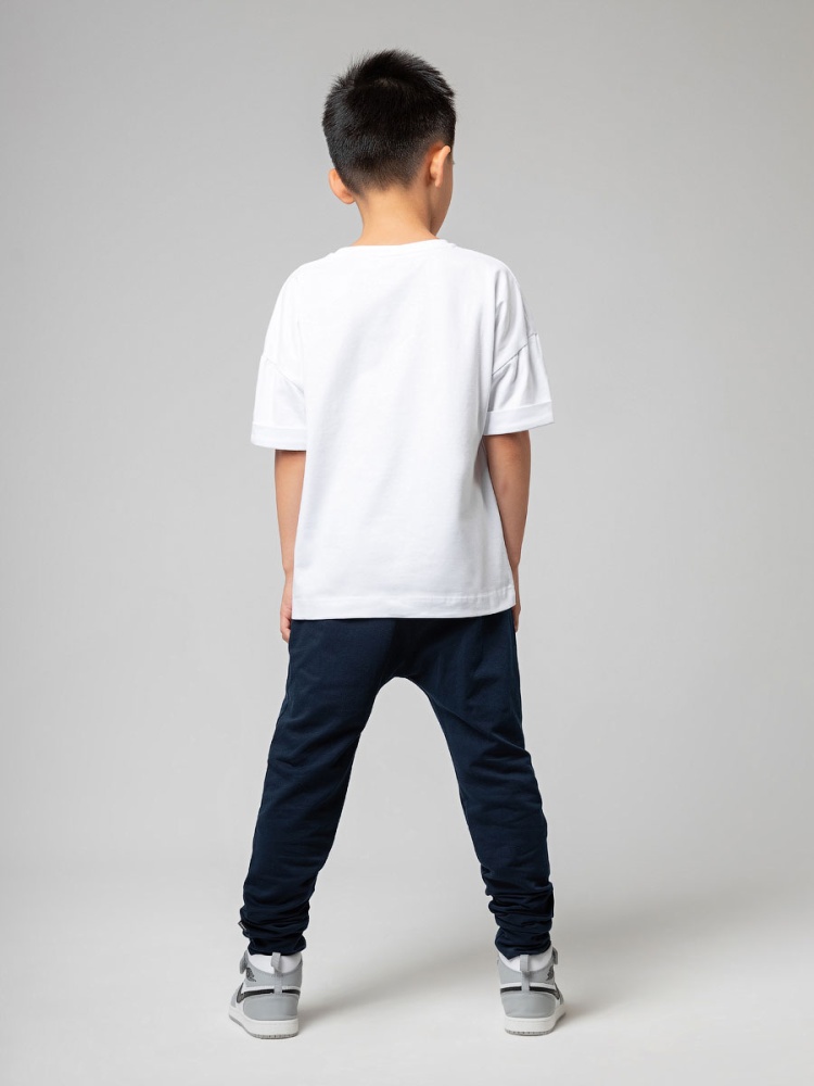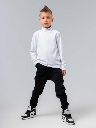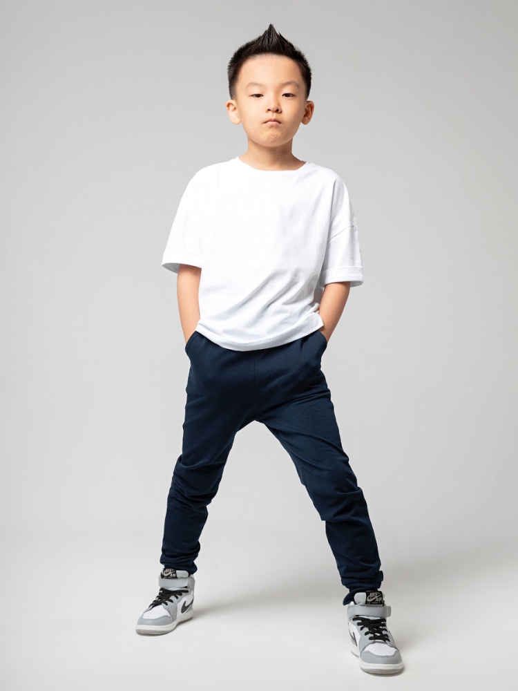Материал футер двухнитка Состав 92% хлопок 8% лайкра Брюки- джоггеры детские. Детали: полуприлегающий покрой, пояс - эластичная резинка, низ изделия- манжеты, карманы с отрезным бочком. Состав: футер двухнитка 92% хлопок 8% лайкра