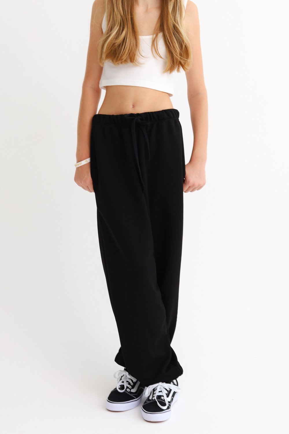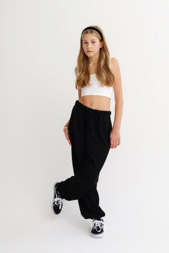 Объемные брюки с цельнокроеным поясом на резинке со шнурком, манжетами на резинке по низу, в боковых швах карманы.
