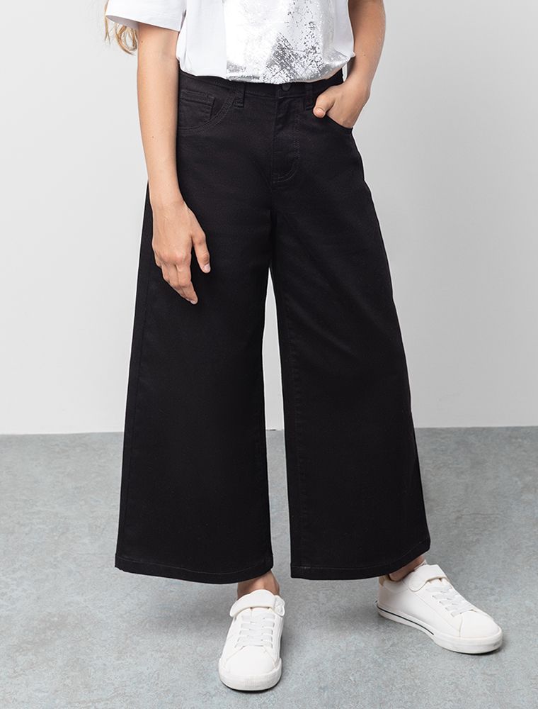 Черные брюки-кюлоты выполнены из плотного хлопкового твила, матовая фактура которого передает насыщенность цвета. Такой материал не нарушает лаконичный вид модели, поэтому она впишется в строгий школьный образ и в тоже время, будет хорошо сочетаться с яркими футболками. Объем в талии регулируется перфорированной резинкой в поясе, перестёгивающейся на пуговицу.