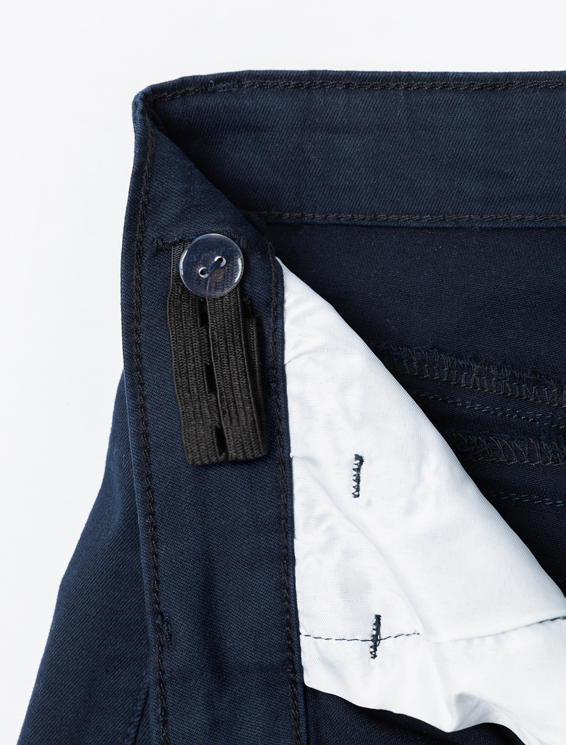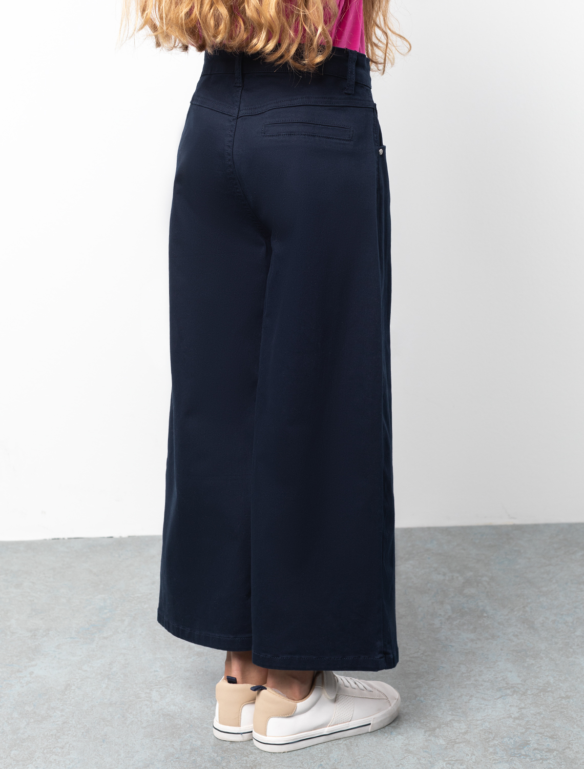 Универсальный темно-синий оттенок этих брюк-кюлот получился особенно глубоким. За это отвечает плотный хлопковый твил, матовая фактура которого передает насыщенность. Такой материал не нарушает лаконичный вид модели, поэтому она впишется в строгий школьный образ и в тоже время, будет хорошо сочетаться с яркими футболками. Объем в талии регулируется перфорированной резинкой в поясе, перестёгивающейся на пуговицу.
