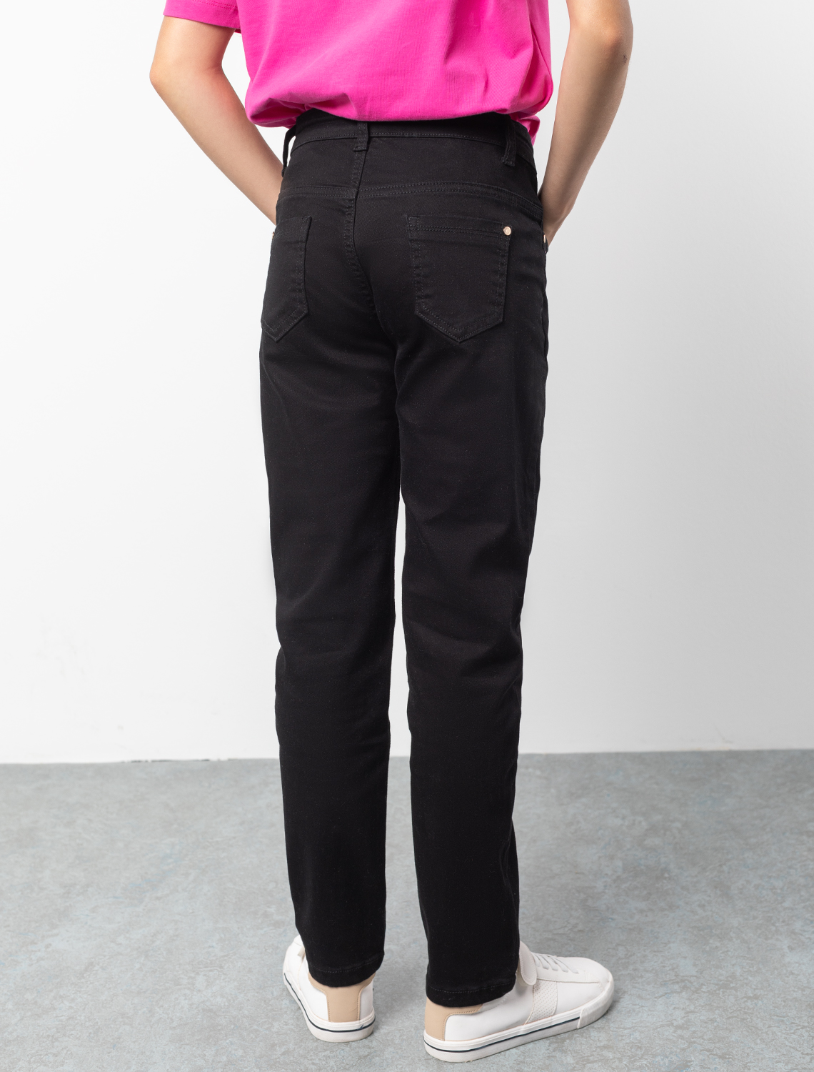 Универсальный черный цвет делает эти брюки-скини с двумя боковыми карманами удачным решением для создания школьного образа. Модель сшили из мягкого прочного твила на основе хлопка. За счет входящего в состав материала эластана изделие не деформируется после частых стирок. Объем в талии регулируется перфорированной резинкой в поясе, перестёгивающейся на пуговицу.