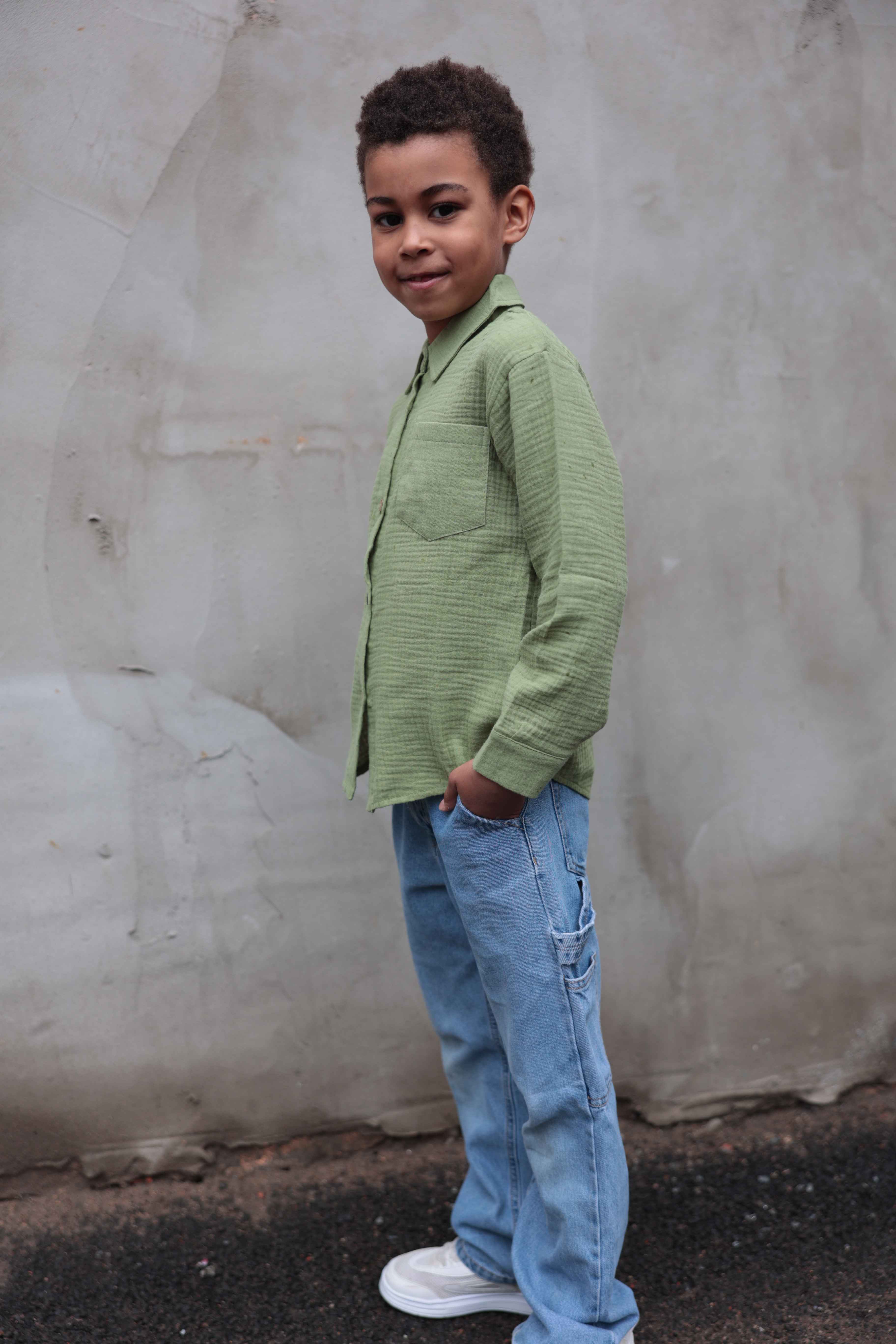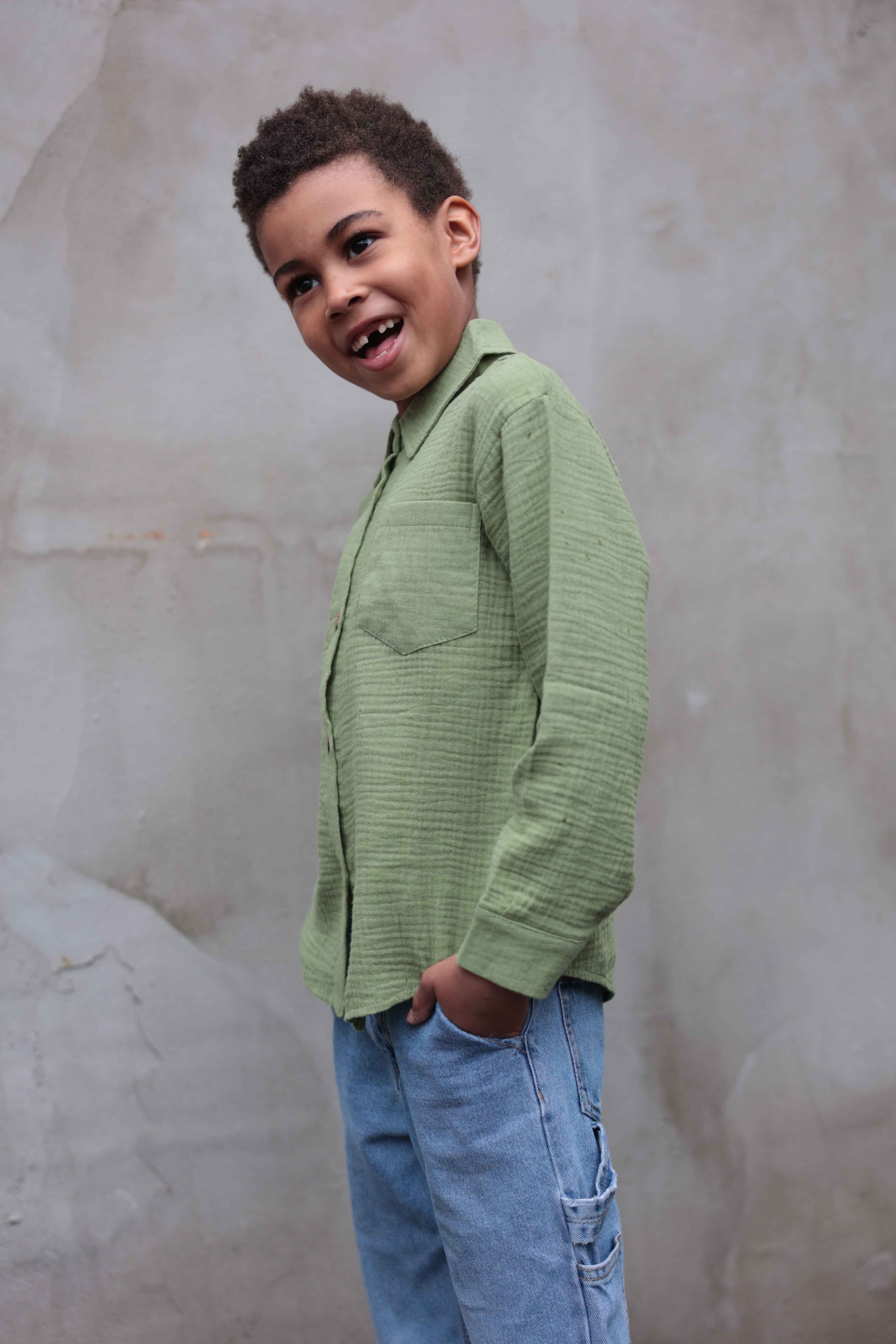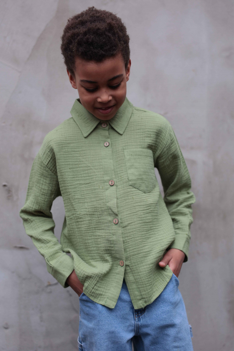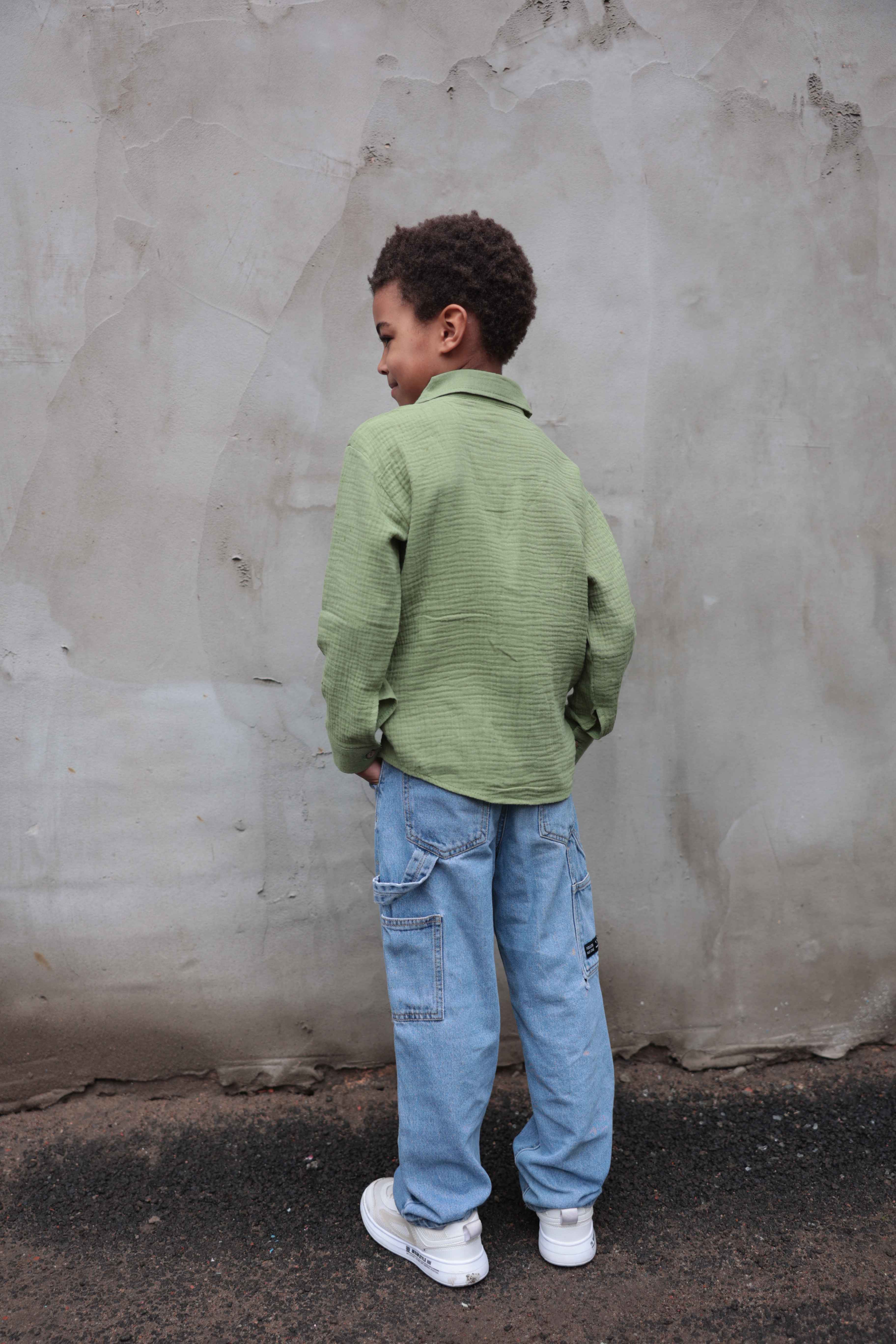 Легкая муслиновая рубашка для мальчика цвета хаки – идеальный выбор для жаркого лета!