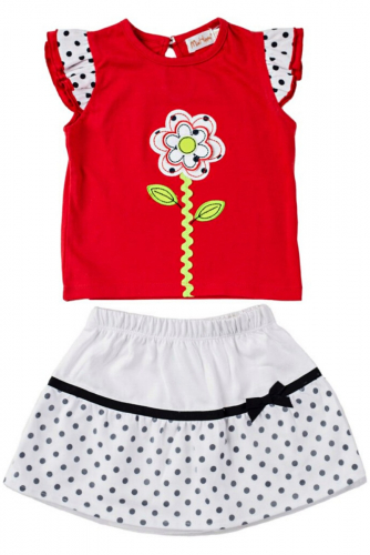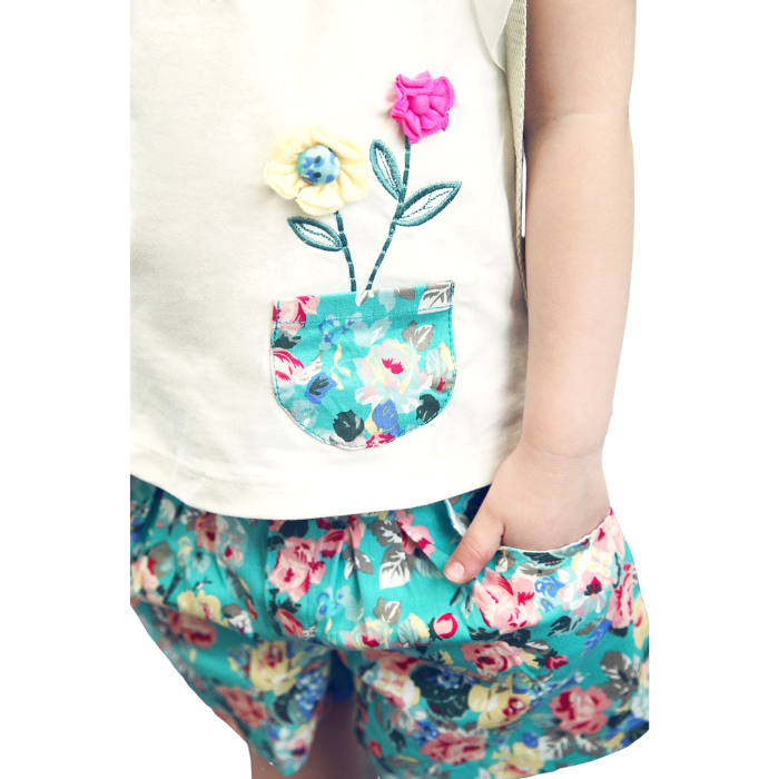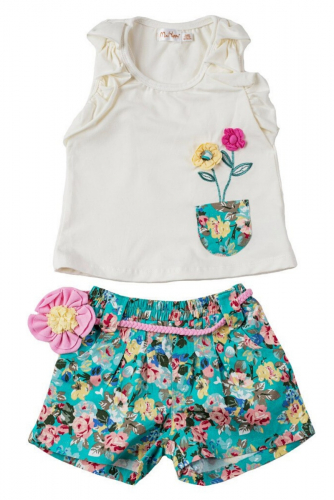 Хлопковый костюм Mini Hippy для девочек сочетает белую майку и шортики в цветочек. Удобный и очень красивый вариант для сада, прогулок в парке или на праздник. Майка декорирована пришивной аппликацией и кармашком. В шортах предусмотрены кармашки, пояс на резинке, красиво дополняет образ поясок-цветок на кнопке.Повседневный трикотаж Mini Hippy это: