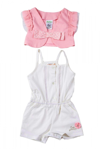 Модный и практичный комплект на лето для девочки. Цветовая гамма майки и шортиков позволяет сочетать между как самостоятельный комплект, так и с другими вещами в гардеробе девочки, оставляя образ все таким же модным. Комплект выполнен из дышащего и мягкого материала. Модель майки без рукавов, края проймы и горловины обработаны косой трикотажной бейкой светло-розового цвета. Шортики застегиваются на пуговичку, розовый декоративный поясок вшит в боковые швы. Образ дополнен принтом на ткани, бусинками и бантиками.