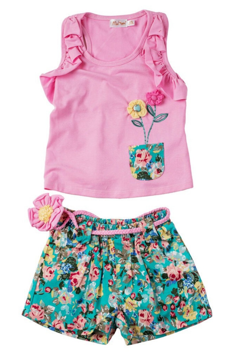 Хлопковый костюм Mini Hippy для девочек сочетает розовую майку и шортики в цветочек. Удобный и очень красивый вариант для сада, прогулок в парке или на праздник. Майка декорирована пришивной аппликацией и кармашком. В шортах предусмотрены кармашки, пояс на резинке, красиво дополняет образ поясок-цветок на кнопке.
