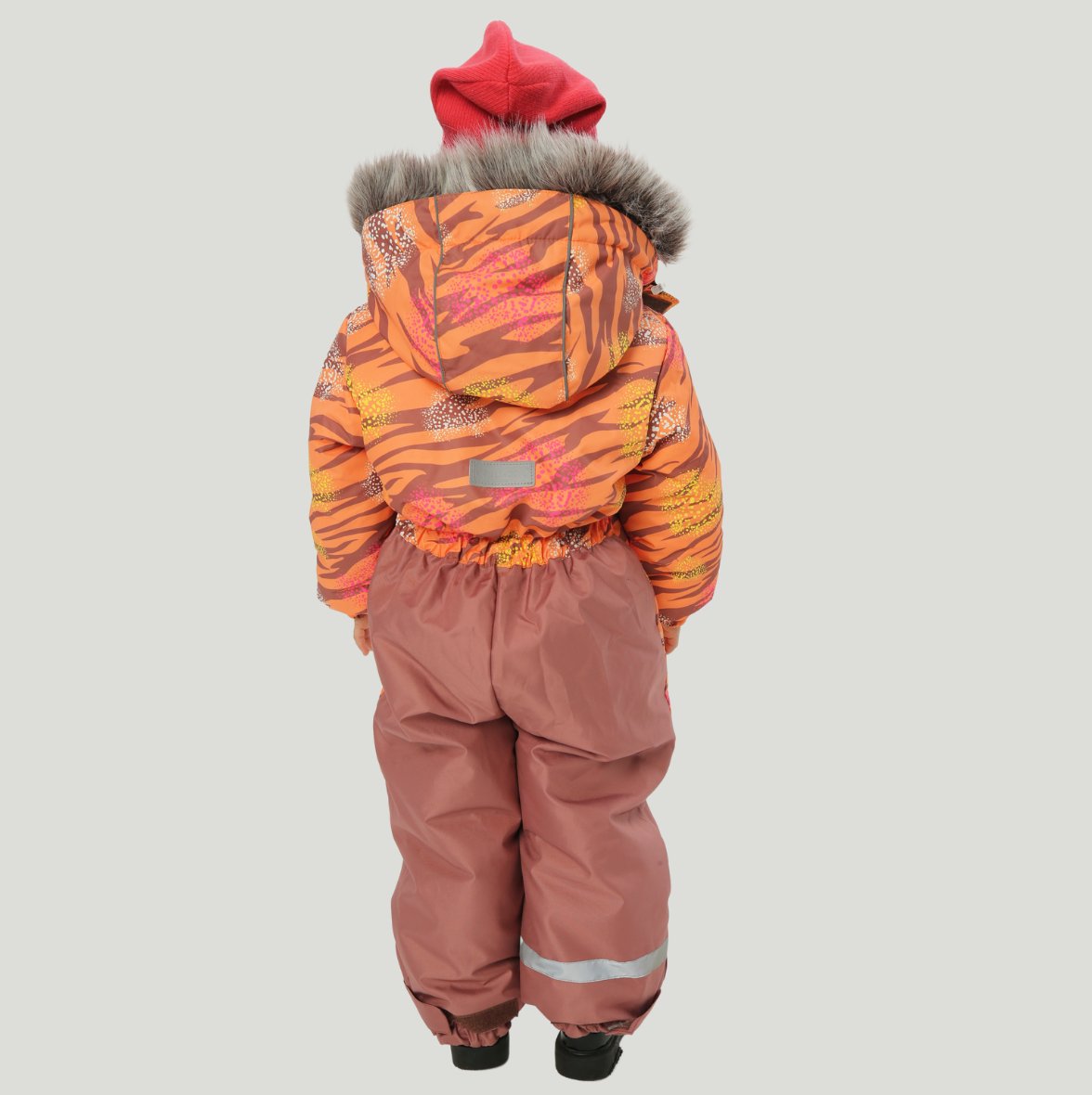 Функциональные элементы утепленного комбинезона для детей: -Съёмный капюшон и опушка из искусственного меха;