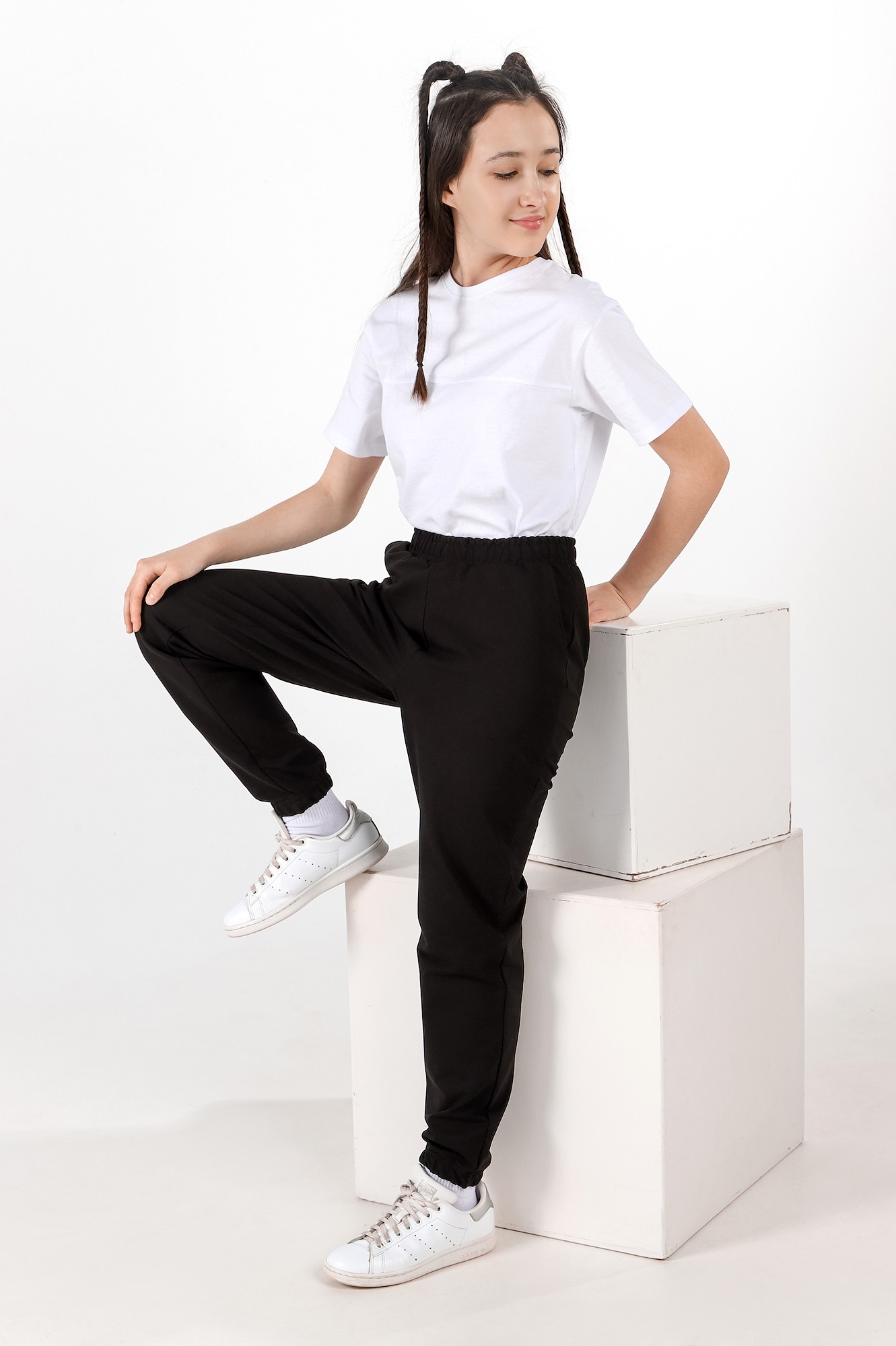 Базовые брюки из футера с лайкрой для девочки. Модель с боковыми карманами, на притачном поясе с отстроченной эластичной тесьмой и внутренним шнуром для регулировки плотности посадки на талии. Низ брючин с эластичной тесьмой.