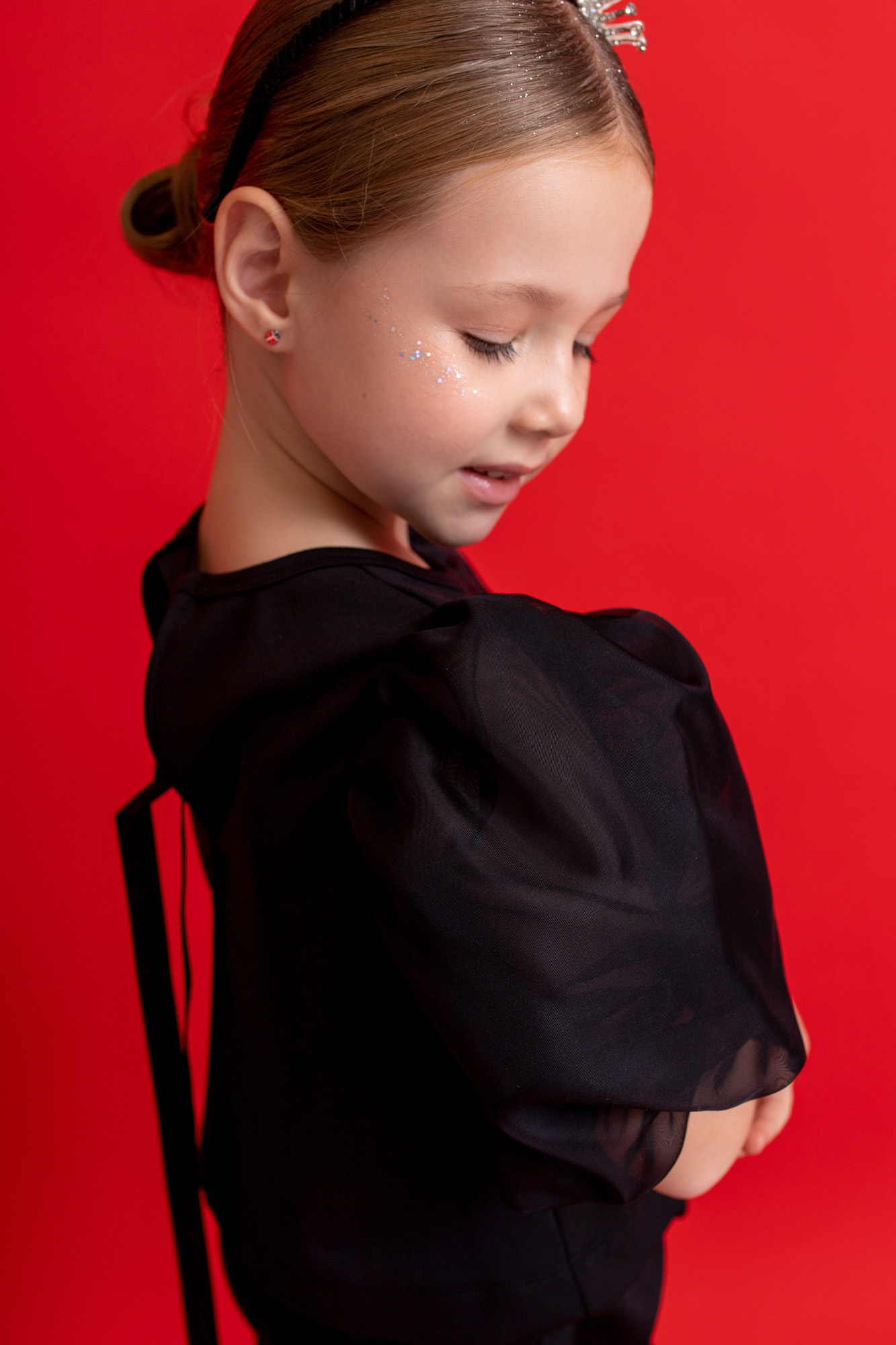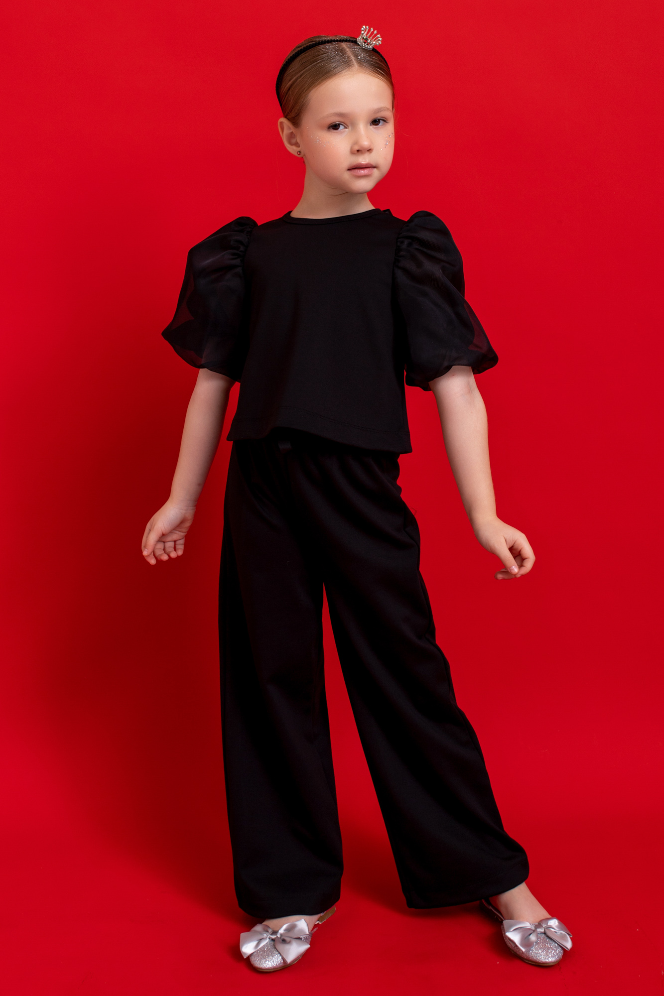 Состоит из топа с воздушными капроновыми рукавами и брюк-палаццо.