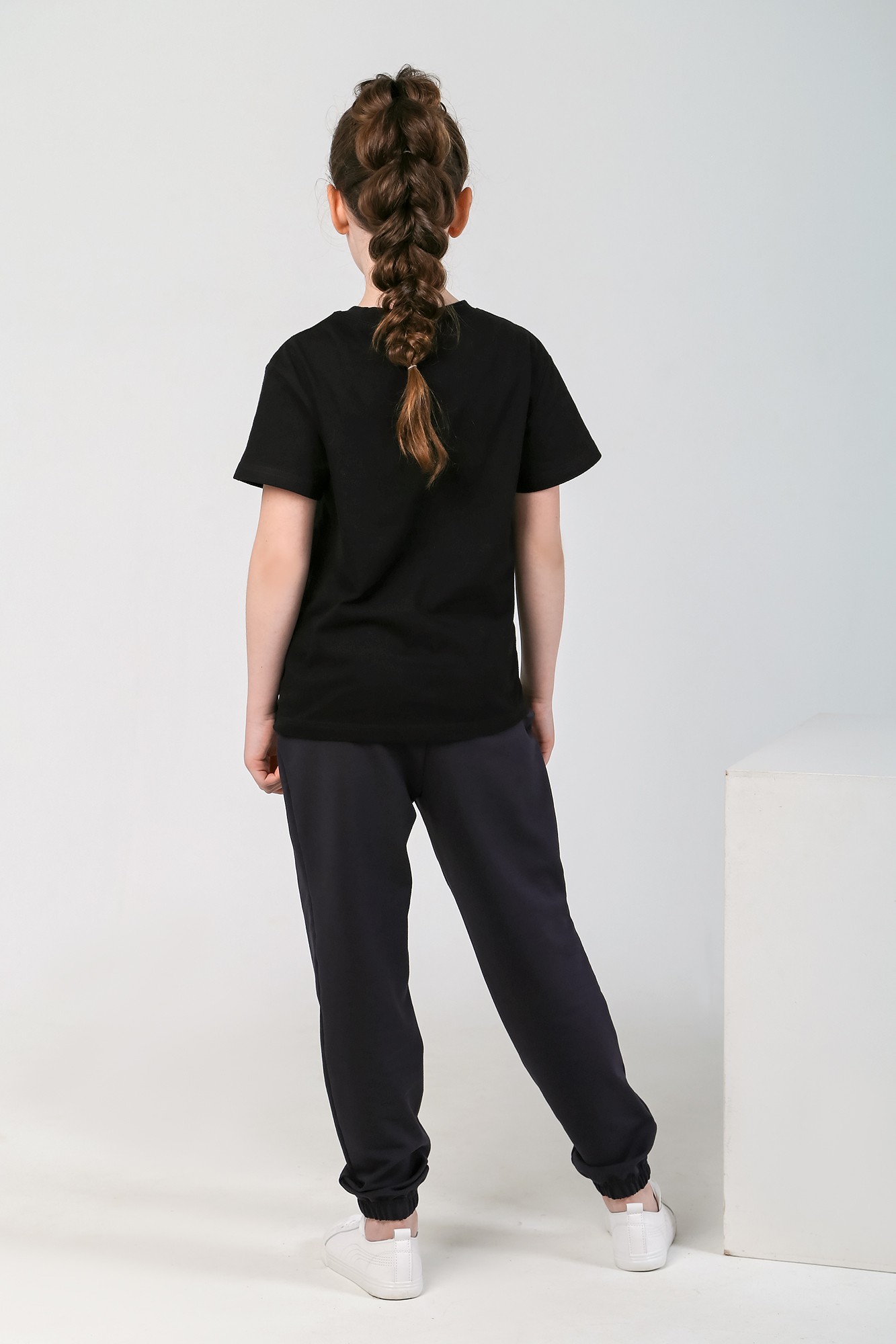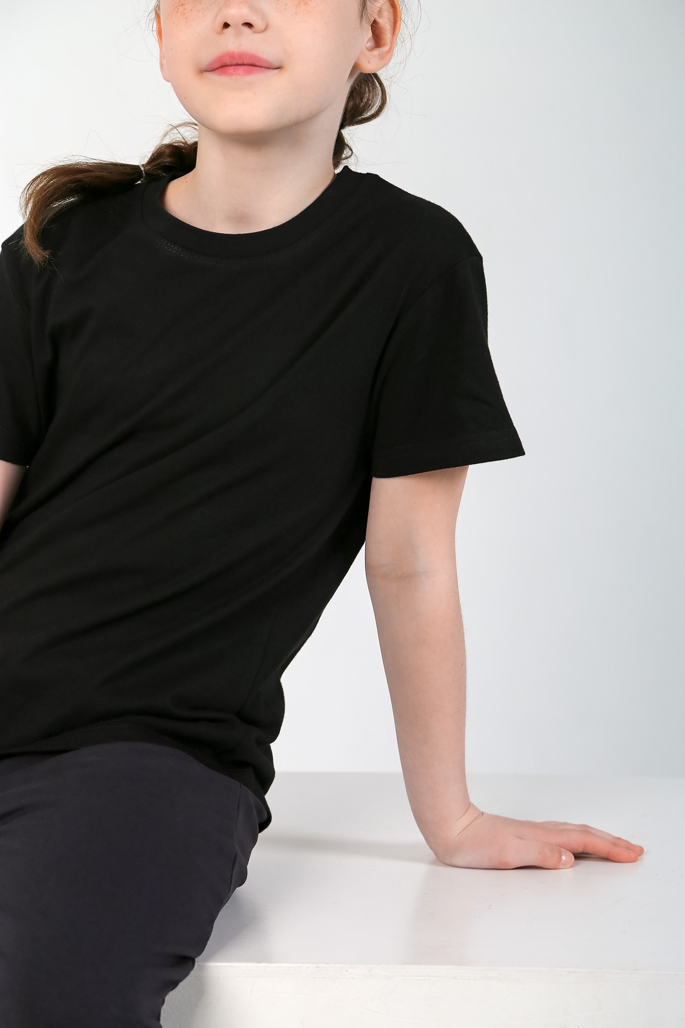 Базовая футболка для девочки, из кулирки плотностью 160г/м2. Модель со слегка спущенной линией плеч и округлым вырезом горловины.