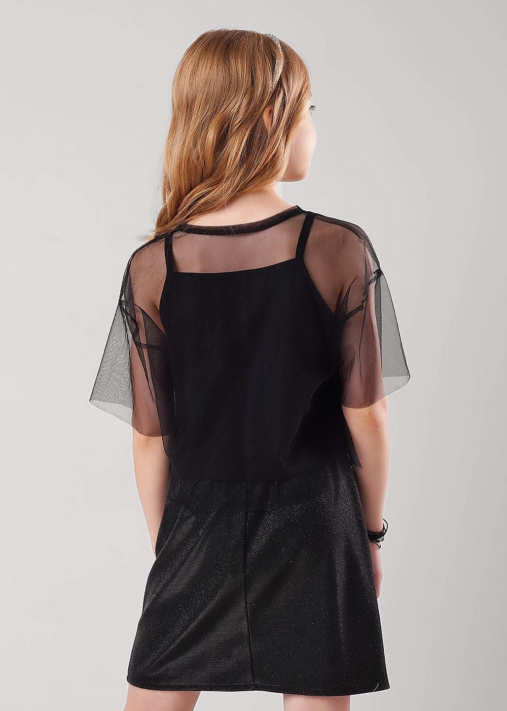 Двухслойная футболка для девочки. Рукава и верхний слой выполнены из сетки, нижний слой - из хлопкового трикотажа с эластаном. Свободная посадка. Стильная модель для праздника.