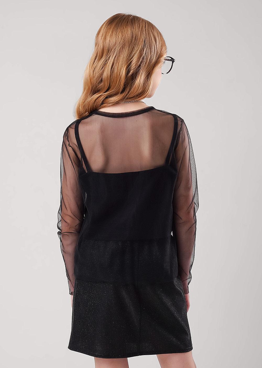 Двухслойный нарядный укороченный лонгслив из сетки. Круглая эластичная горловина. Внутренний слой -майка выполнена из хлопка с эластаном. Прекрасно подойдет как для праздника так и для повседневной носки.