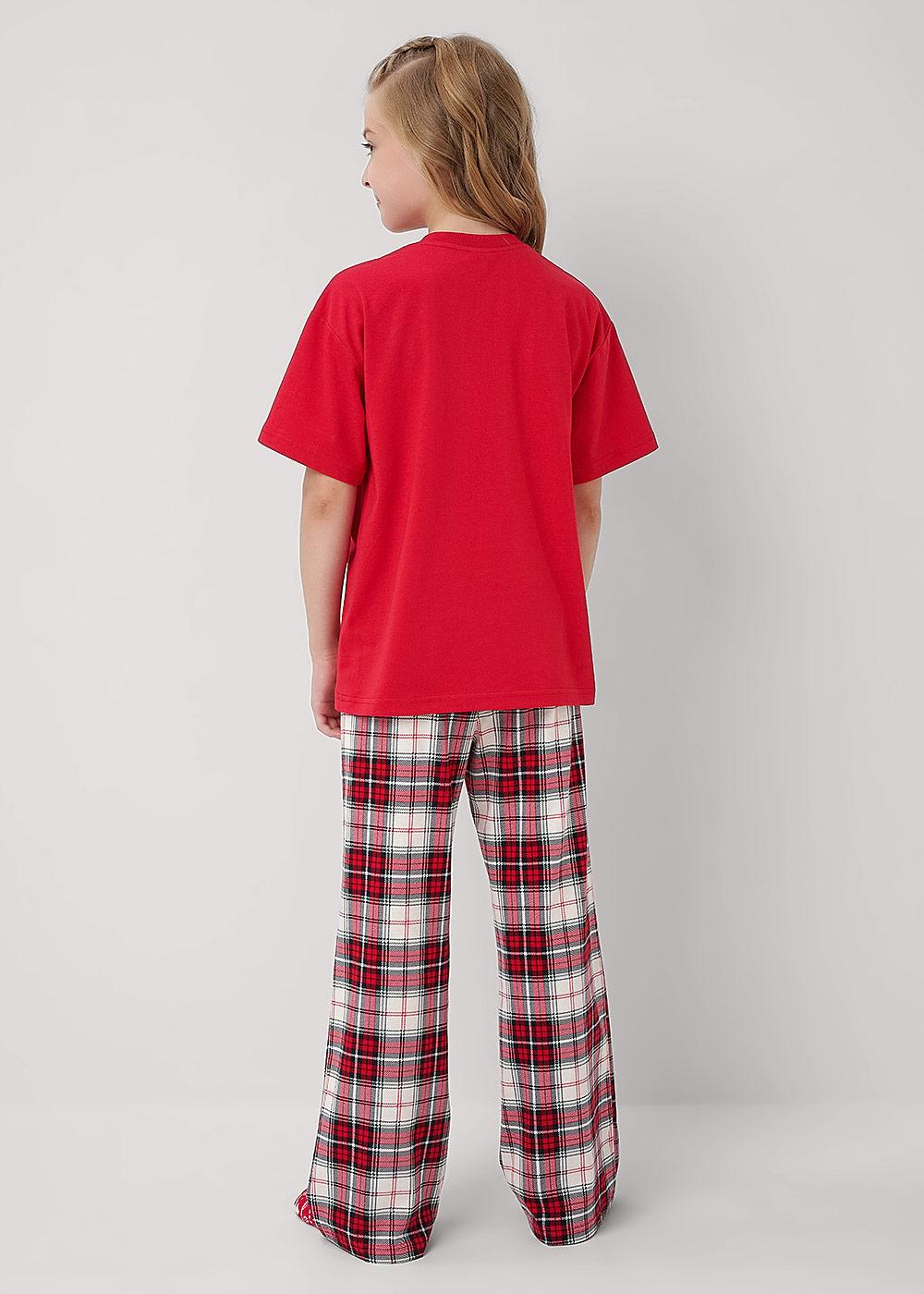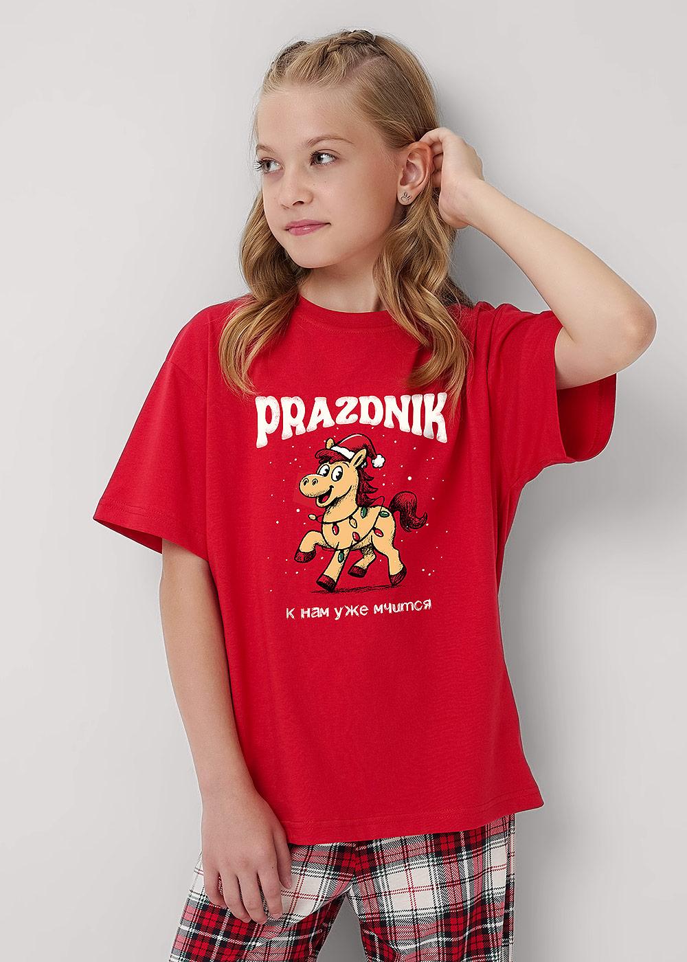 Новогодняя пижама для подростков,состоящая из футболки и брюк. Футболка свободного кроя спереди украшена милым тематическим принтом. Брюки прямые среднего объема с эластичным поясом.