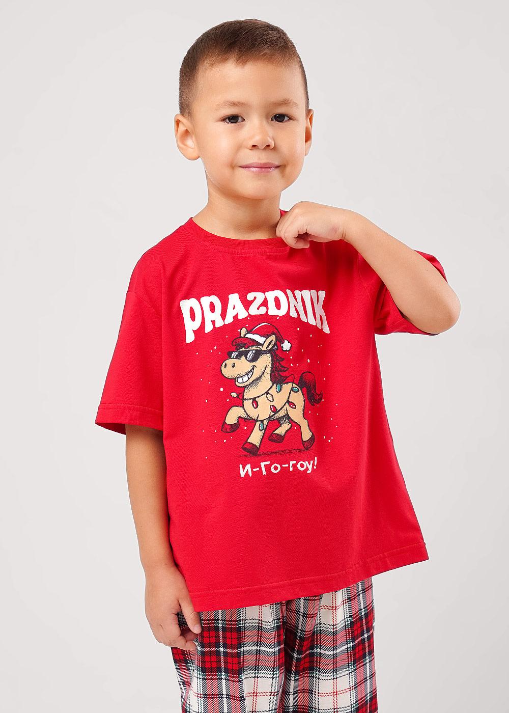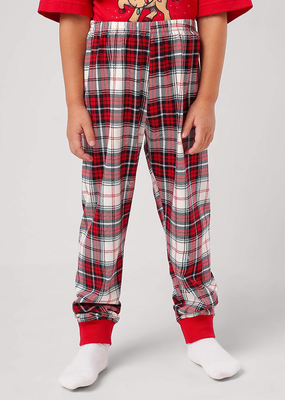 Новогодняя хлопковая пижама для мальчика, состоящая из футболки и брюк. Футболка свободного кроя дополнена оригинальным принтом спереди. Брюки умеренного объёма с эластичным удобным поясом, выполнены из хлопкового полотна в стильную клетку.