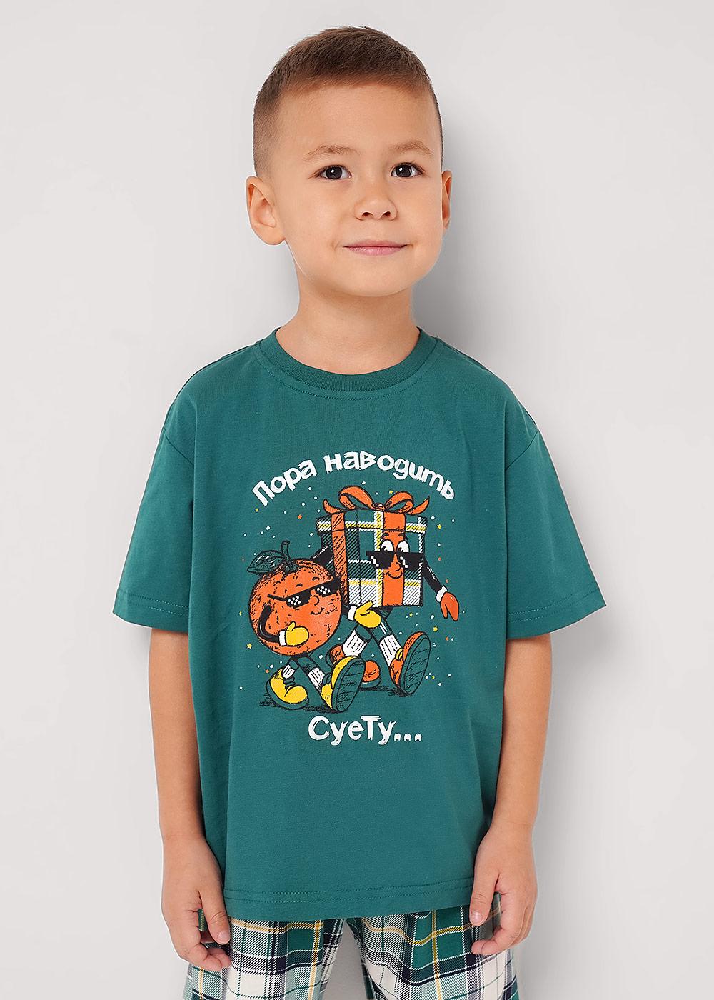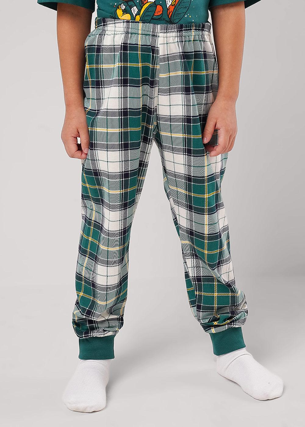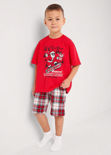 Новогодняя хлопковая пижама для мальчика, состоящая из футболки и брюк. Футболка свободного кроя дополнена оригинальным принтом спереди. Брюки умеренного объёма с эластичным удобным поясом, выполнены из хлопкового полотна в стильную клетку.