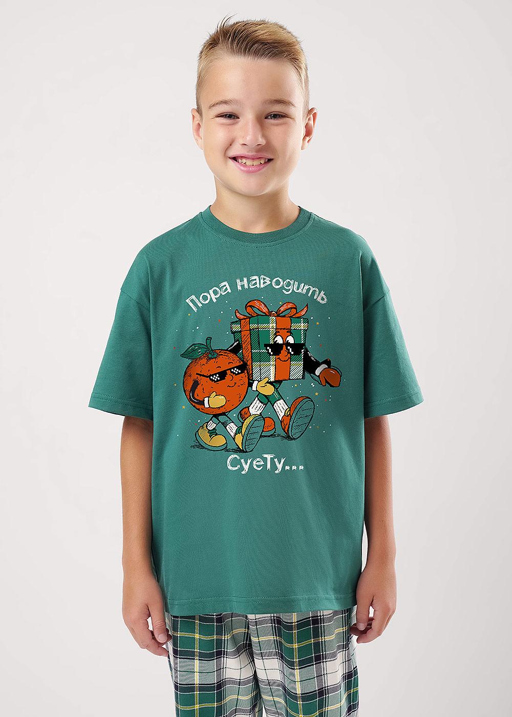 Новогодняя пижама для мальчика-подростка, состоящая из футболки и брюк. Футболка свободного кроя, с оригинальным тематическим принтом. Брюки среднего объема в клетку дополнены манжетами, которые обеспечат комфорт и идеальную посадку