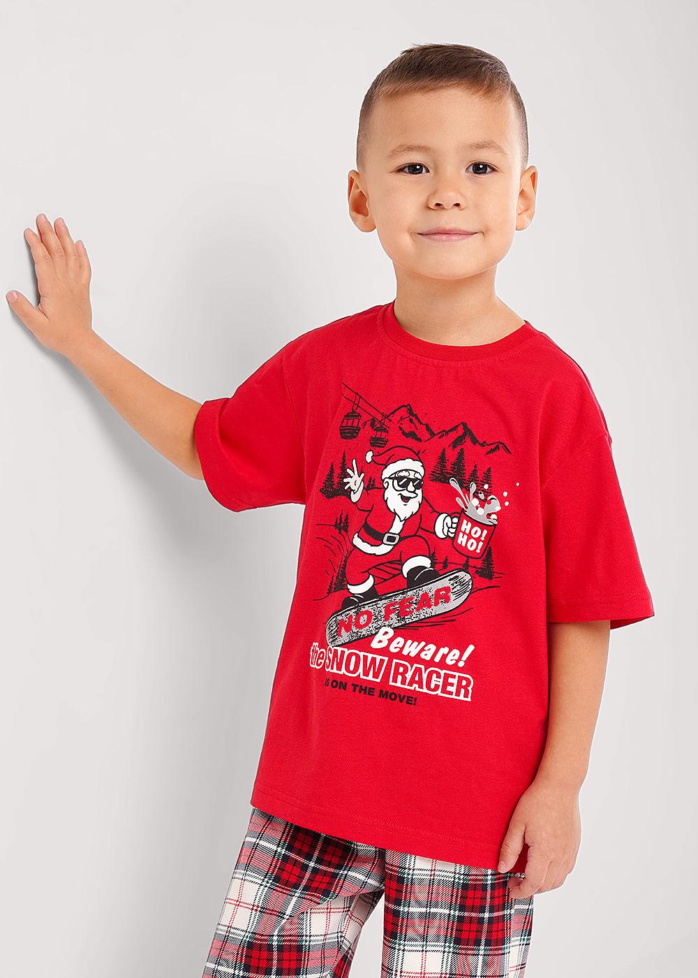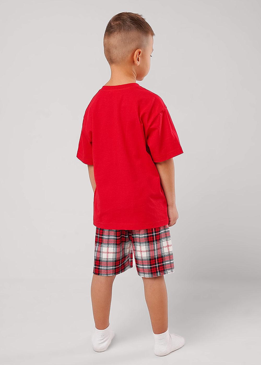 Новогодняя пижама для мальчика, состоящая из футболки и шорт. Стильная футболка свободного кроя дополнена оригинальным принтом. Шорты прямые средней длины с эластичным удобным поясом, выполнены из хлопкового полотна в клетку