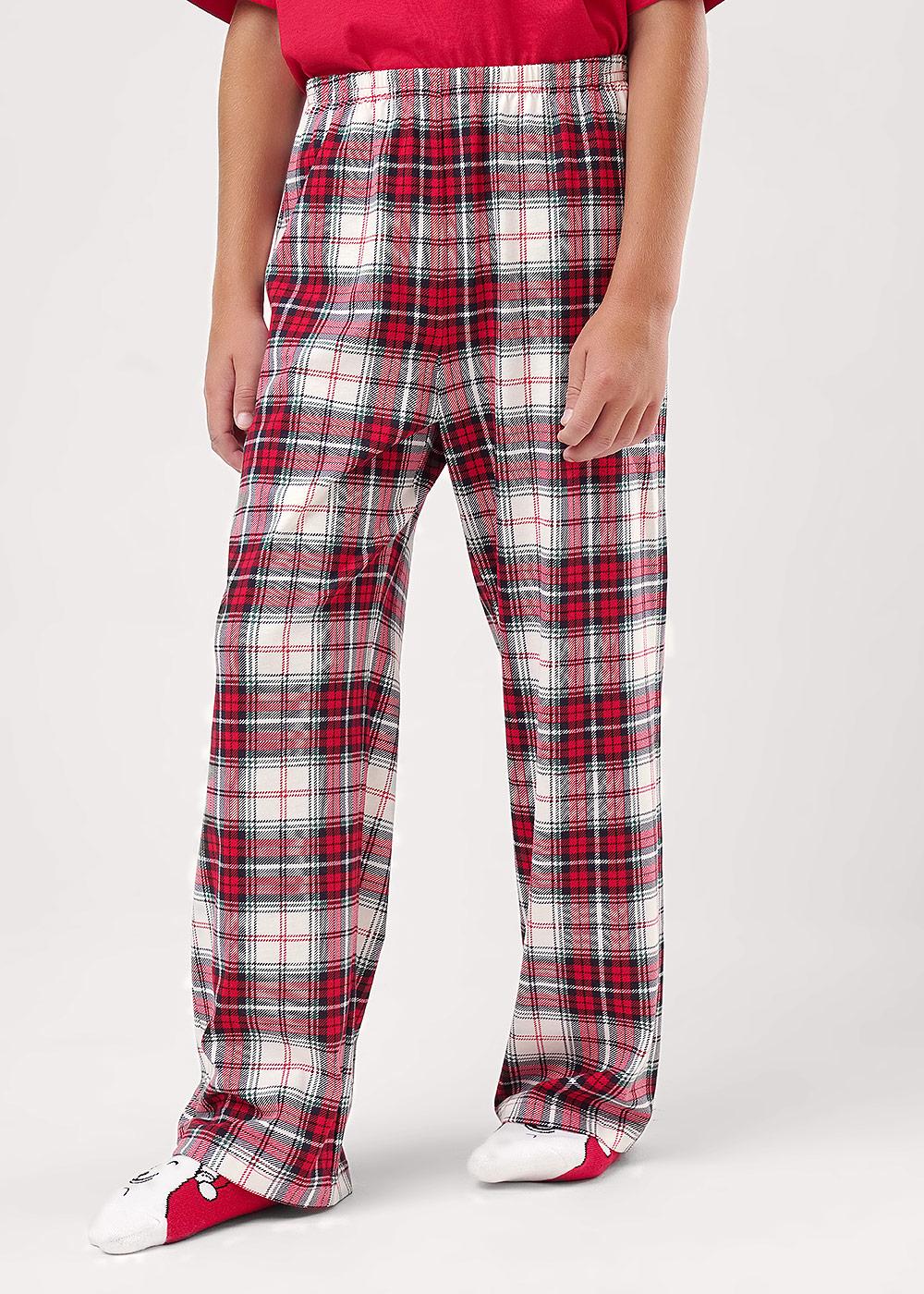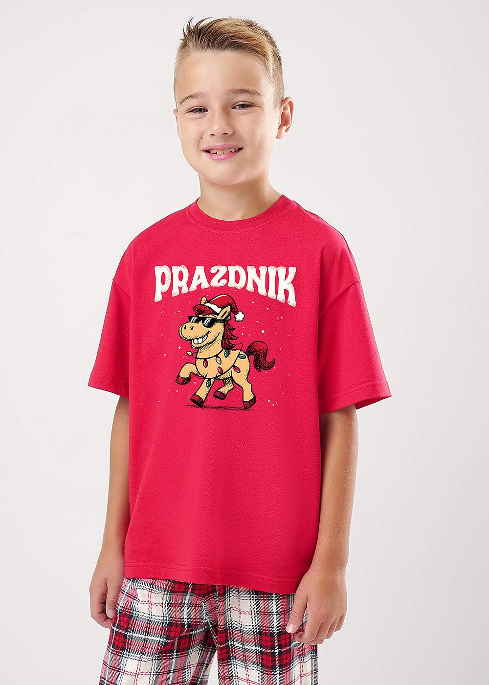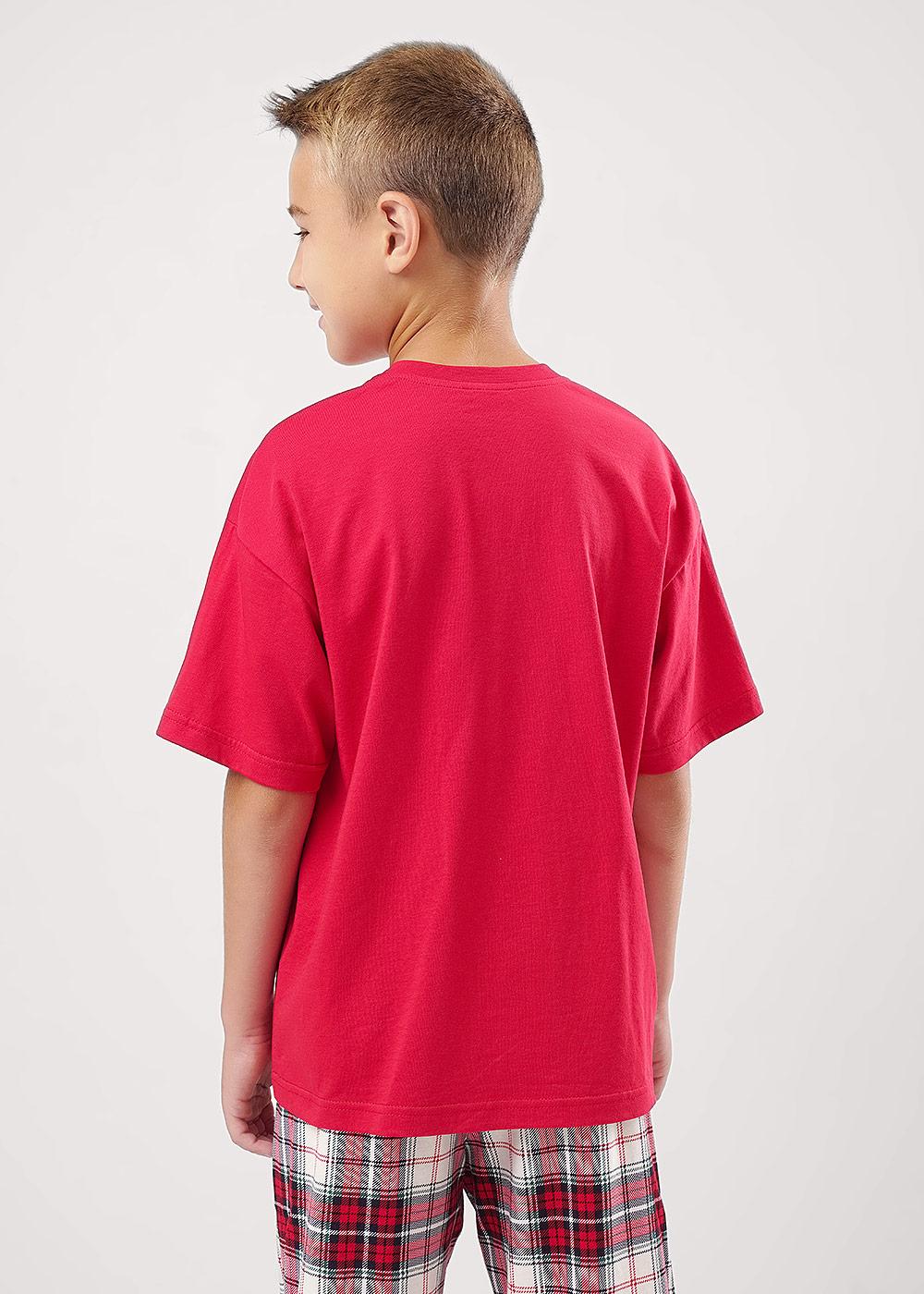 Новогодняя пижама для подростков,состоящая из футболки и брюк. Футболка свободного кроя спереди украшена тематическим принтом. Брюки прямые среднего объема с эластичным поясом.