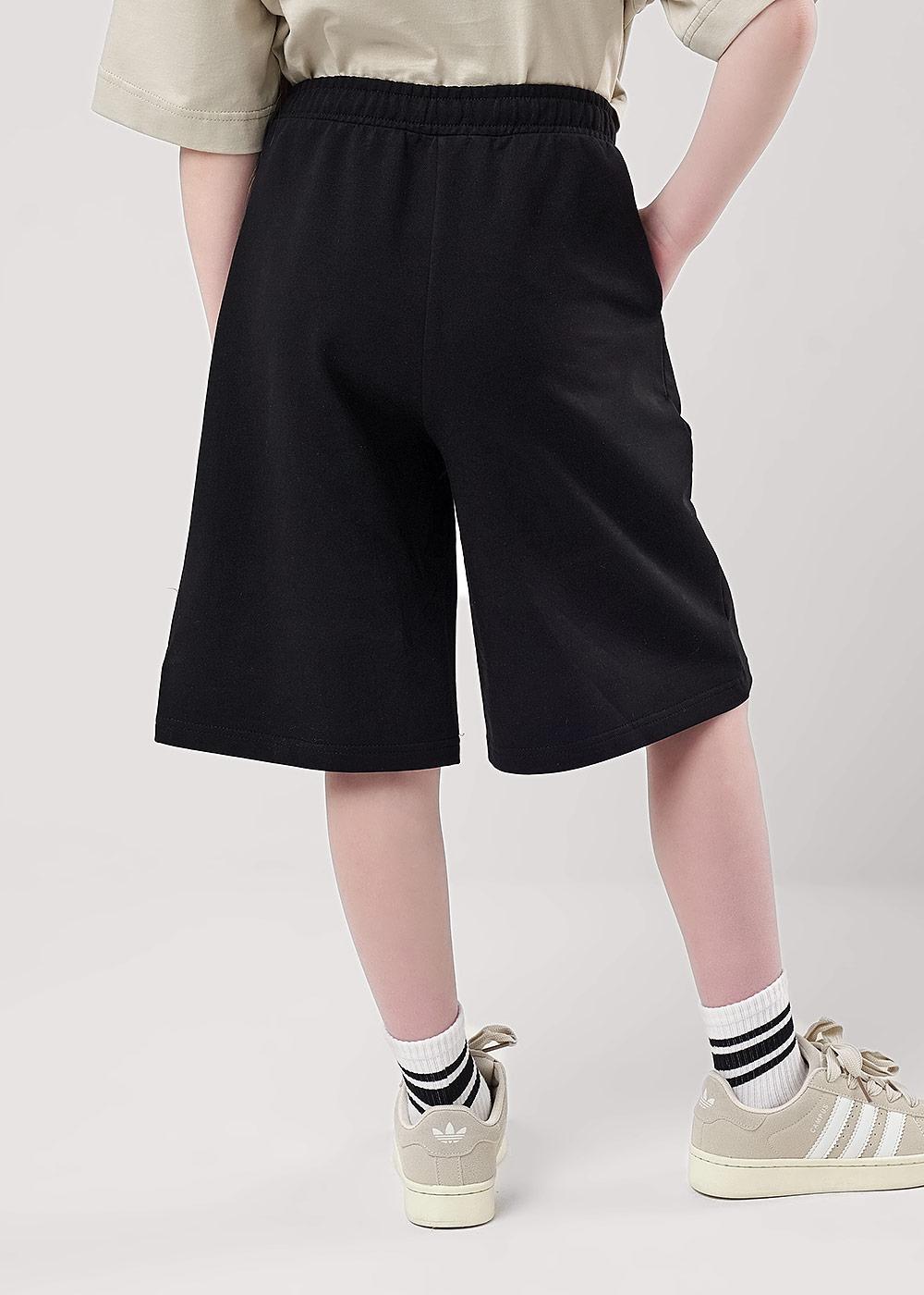 Удлиненные шорты из хлопкового футера. Для комфортной посадки пояс дополнен резинкой. В поясе изнутри регулировка кипером. Для удобства сделаны карманы в отрезном бочке.