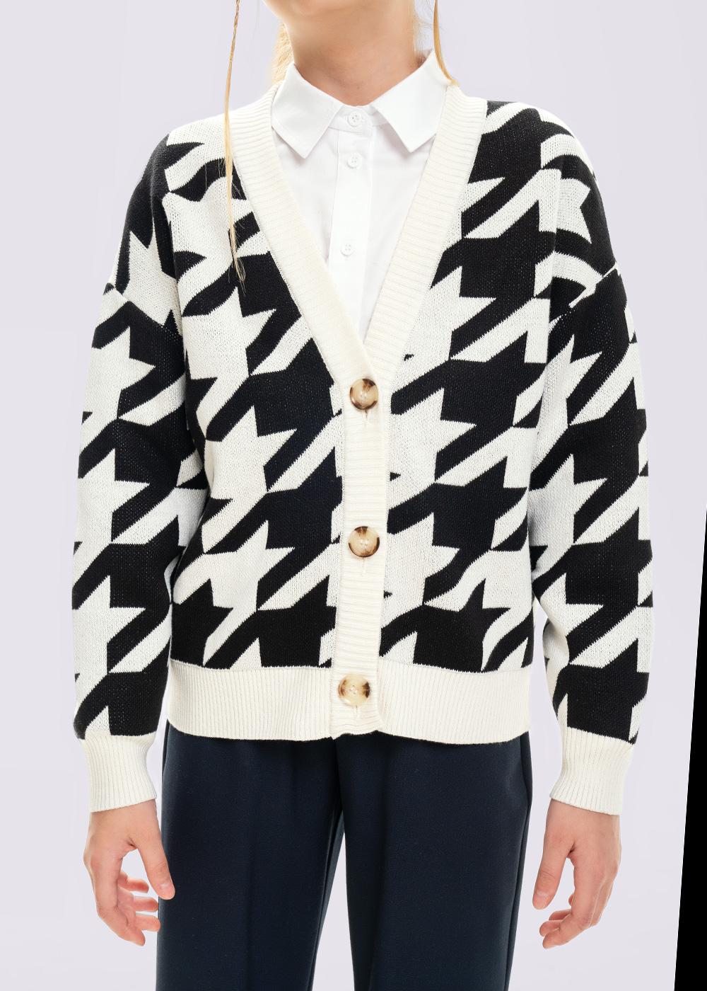 Стильный кардиган из хлопка с добавлением акрила. Трендовая расцветка-крупная гусиная лапка.Свободный силуэт, спущенная линия плеча, застежка на пуговицы. По горловине, низу рукавов и изделия эластичная вязка.