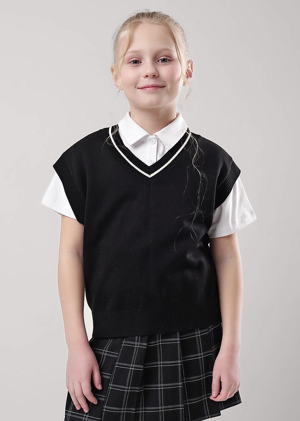 Стильный жилет для девочки в стиле оверсайз из хлопка с добавлением акрила. Прямой силуэт увеличенного объема, V-образный вырез горловины, украшенный контрастной полосой. Модель отлично впишется в школьные и в повседневные образы.